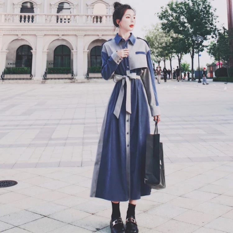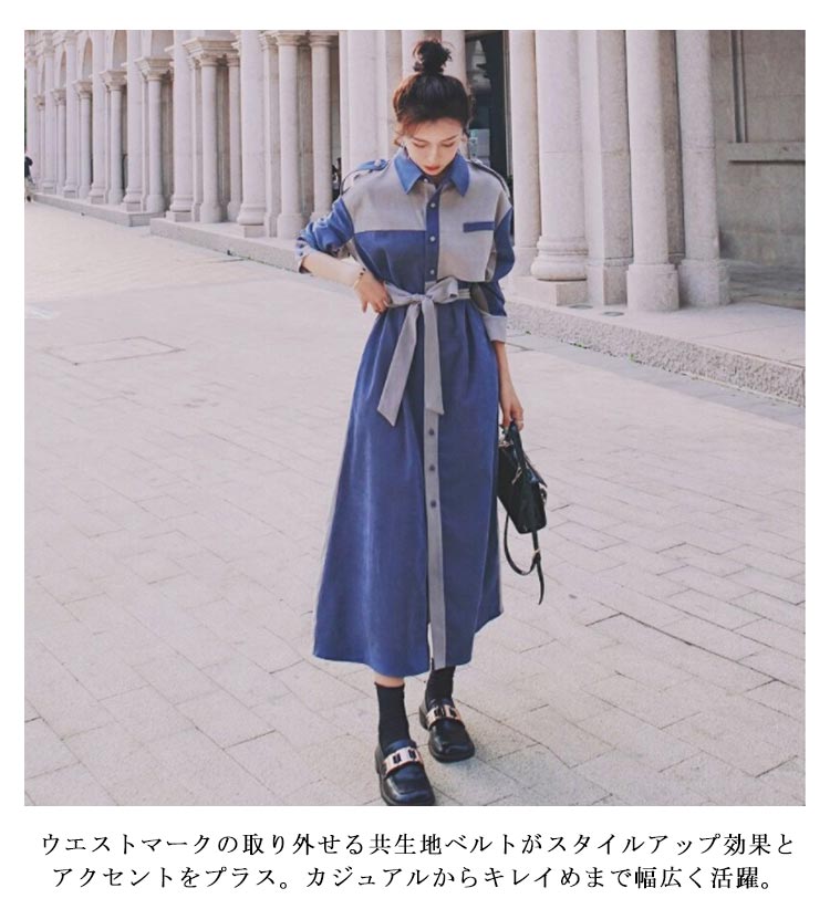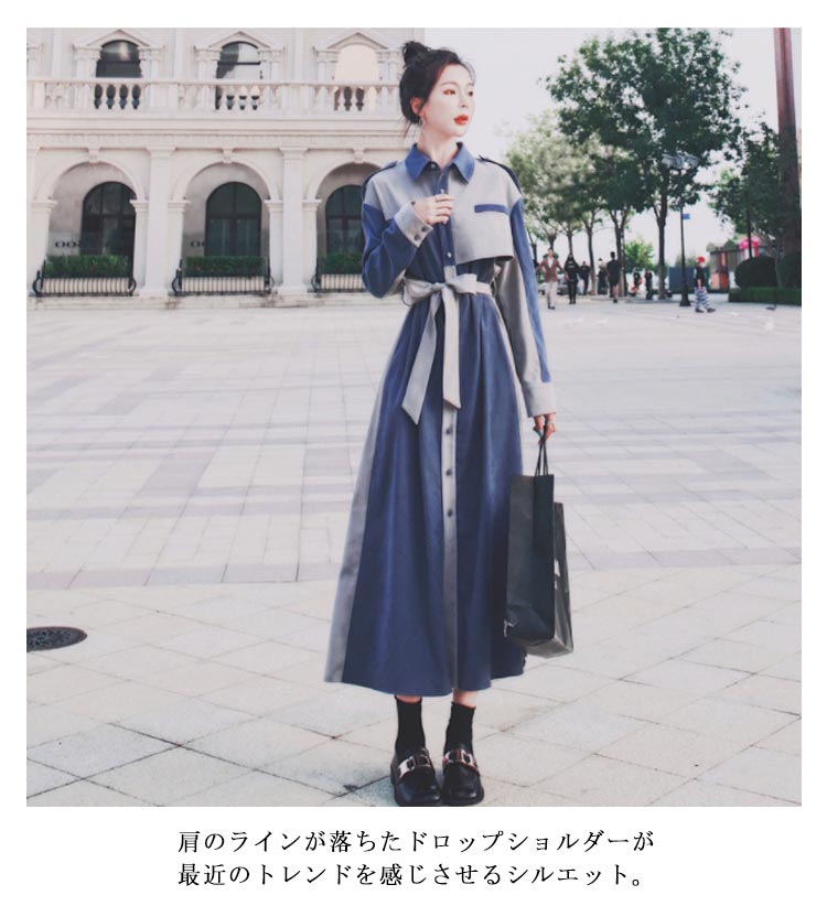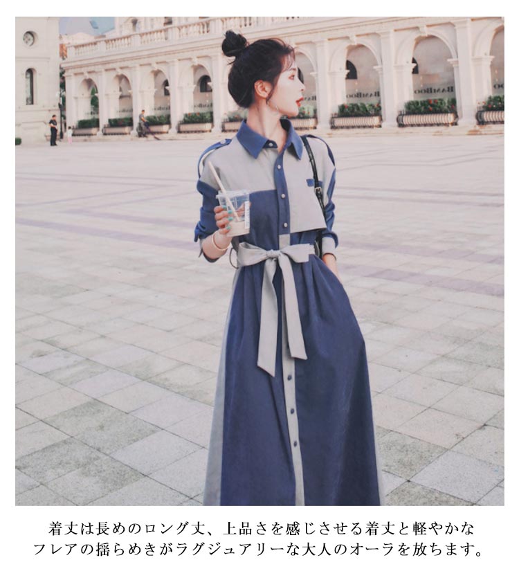 シャツワンピース配色レディースおしゃれデニム風長袖パッチワークマキシワンピースロングコートスプリングコートウエストベルト付きロングワンピーストレンチコート大人可愛い薄