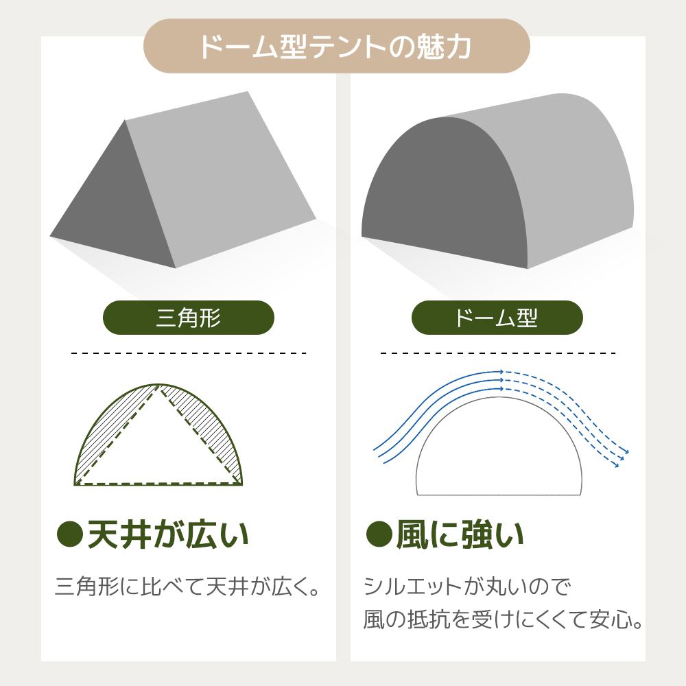 【ドーム型テントの魅力】三角形 ドーム型 ●天井が広い 三角形に比べて天井が広く。 ●風に強い シルエットが丸いので風の抵抗を受けにくく安心。