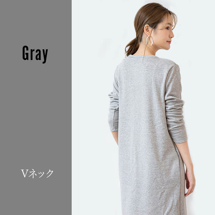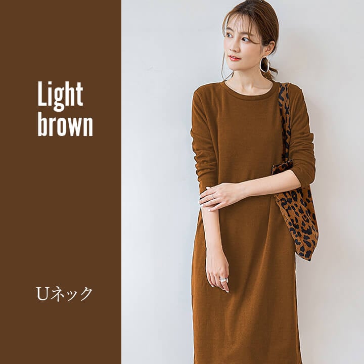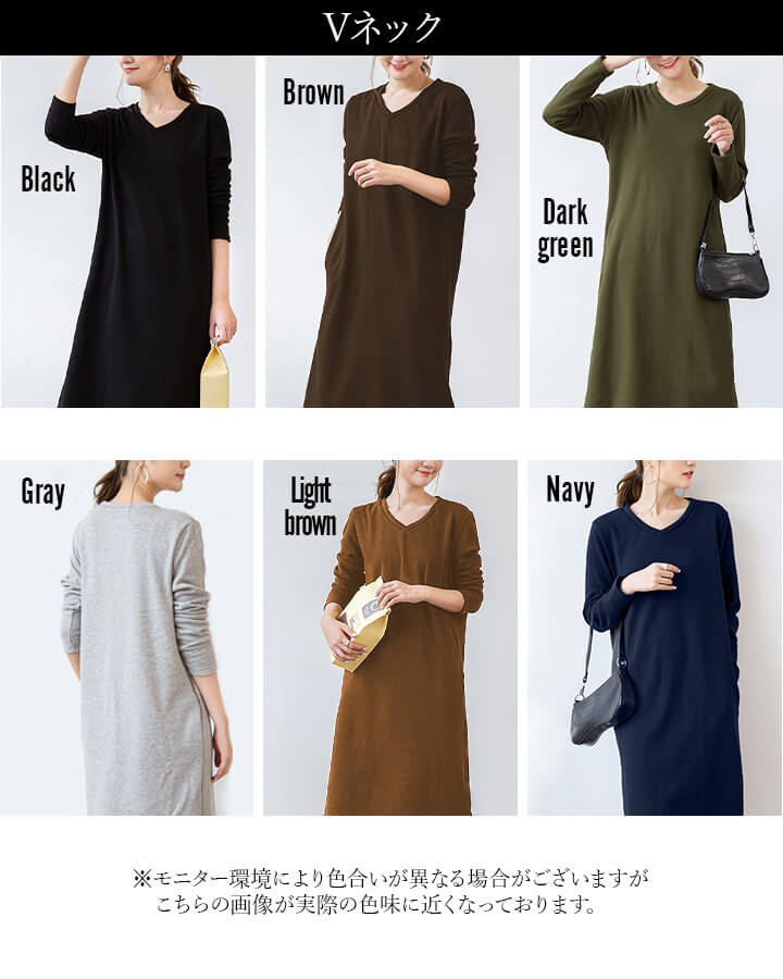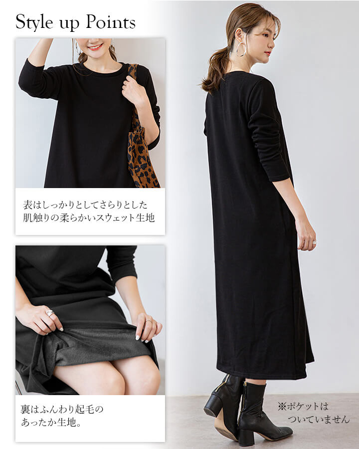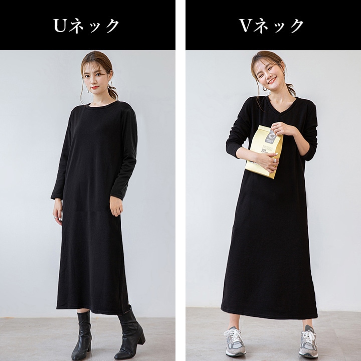 ワンピース 裏起毛 Vネック Uネック 温かい あったかい お洒落 スウェット生地 シンプル 厚手 秋 冬 ミモレ丈 エレガント 大人 落ち着き ママ レディース ブラック 黒 ブラウン 茶 ダークグ