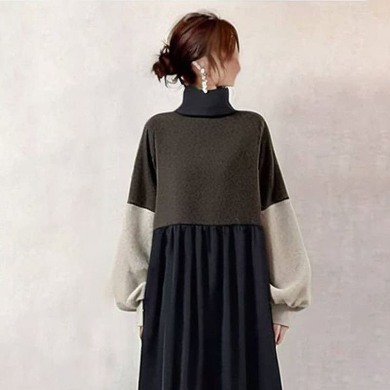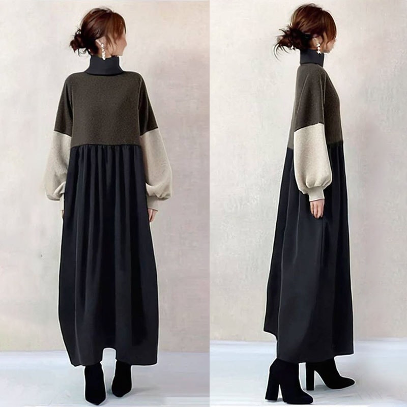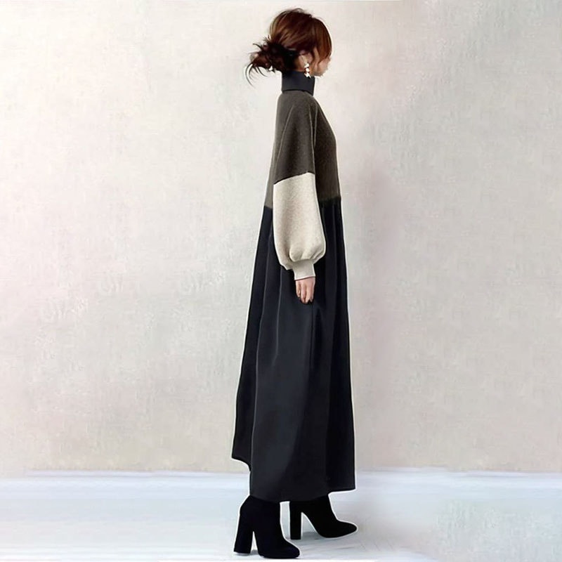 スウェットハイネックワンピース長袖 パフスリーブ ワンピース 着痩せ 膝丈ワンピース上品 韓国風 長袖ロング マキシ丈ワンピ