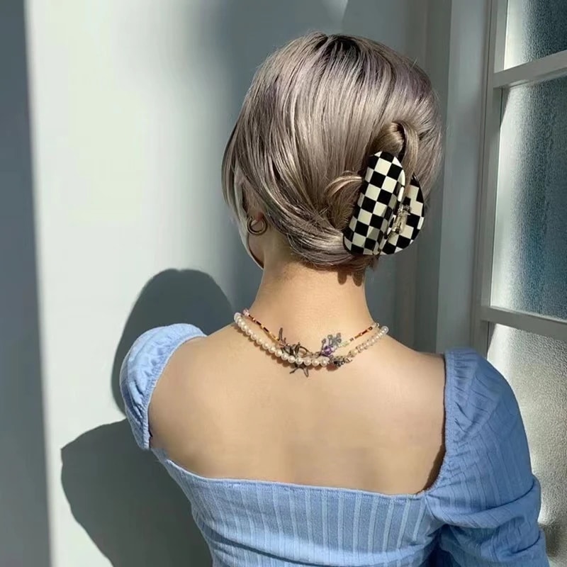 欧米ins黒と白のチェッカーボード半円アセテートキャッ ヘアアクセサリー ヘアクリップ