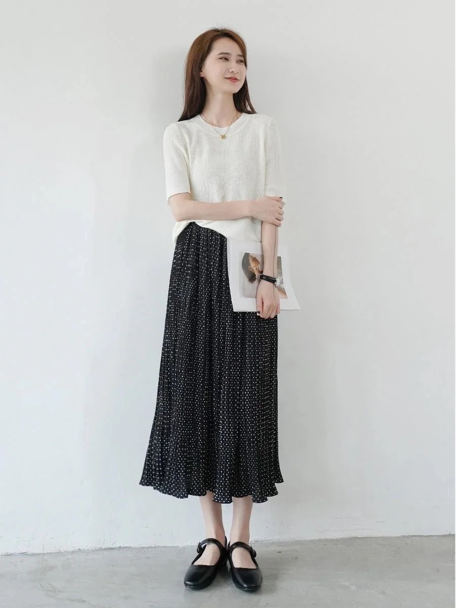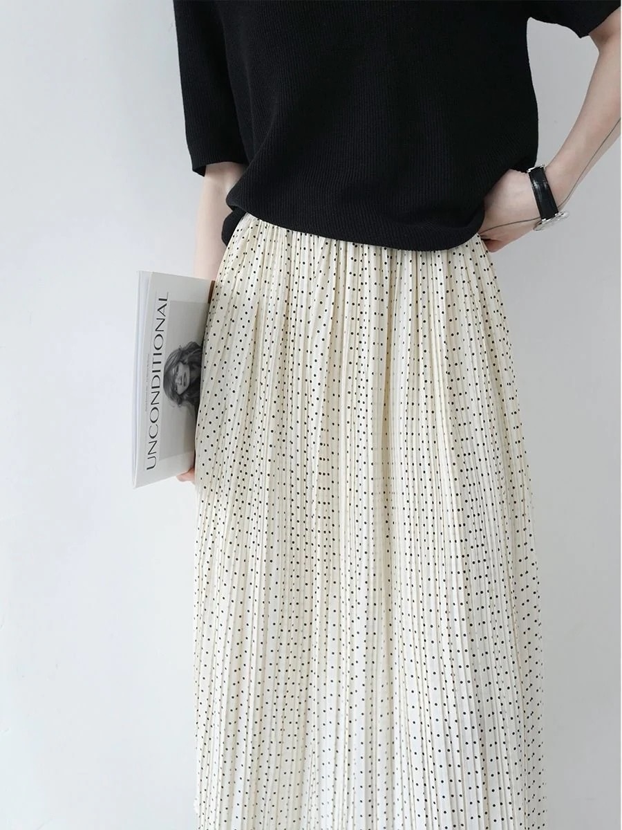 韓国ファッション レディース マキシスカートドットプリント半身スカート夏のハイウエストプリーツスカートハーフスカートミディアム2024新型夏