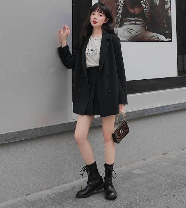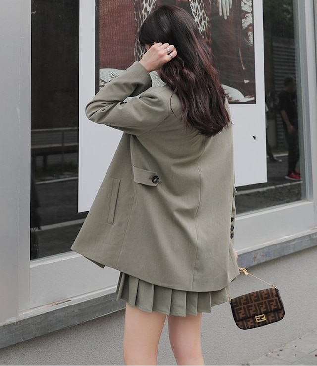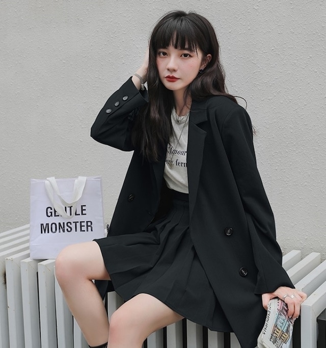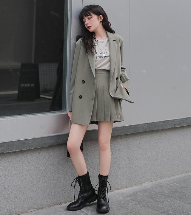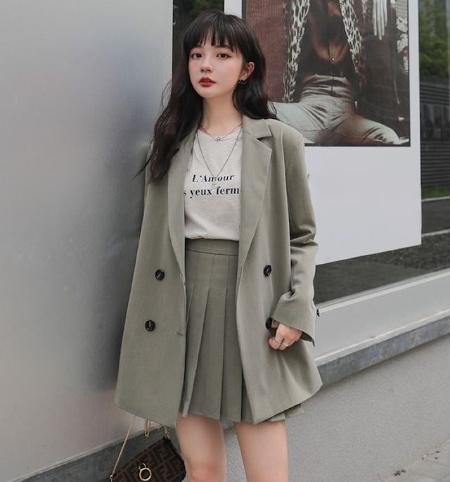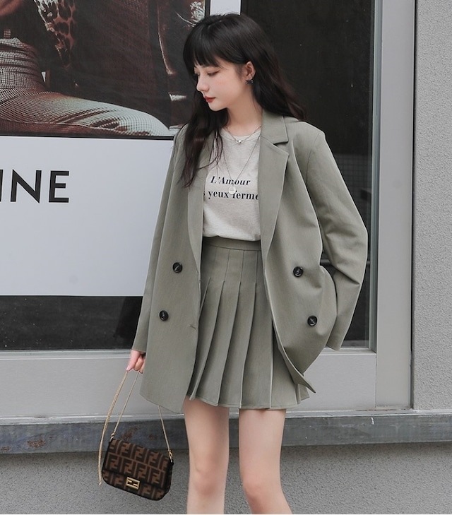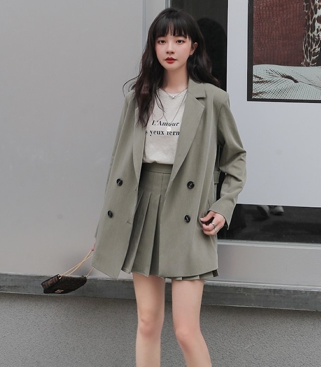 セットアップ ジャケット ミニスカート プリーツスカート ショート丈 ロングテーラードダブルジャケット 上下セット 2点セット 春 秋 レディース ビジネス お出かけ 休日 旅行 普段使い 韓国系