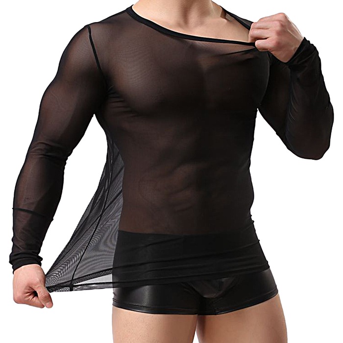 長袖インナー 透ける シースルー メッシュ メンズ 下着 セクシー クルーネック 男性 速乾性 通気性 個性的 無地 M L XL 黒白 mr-003