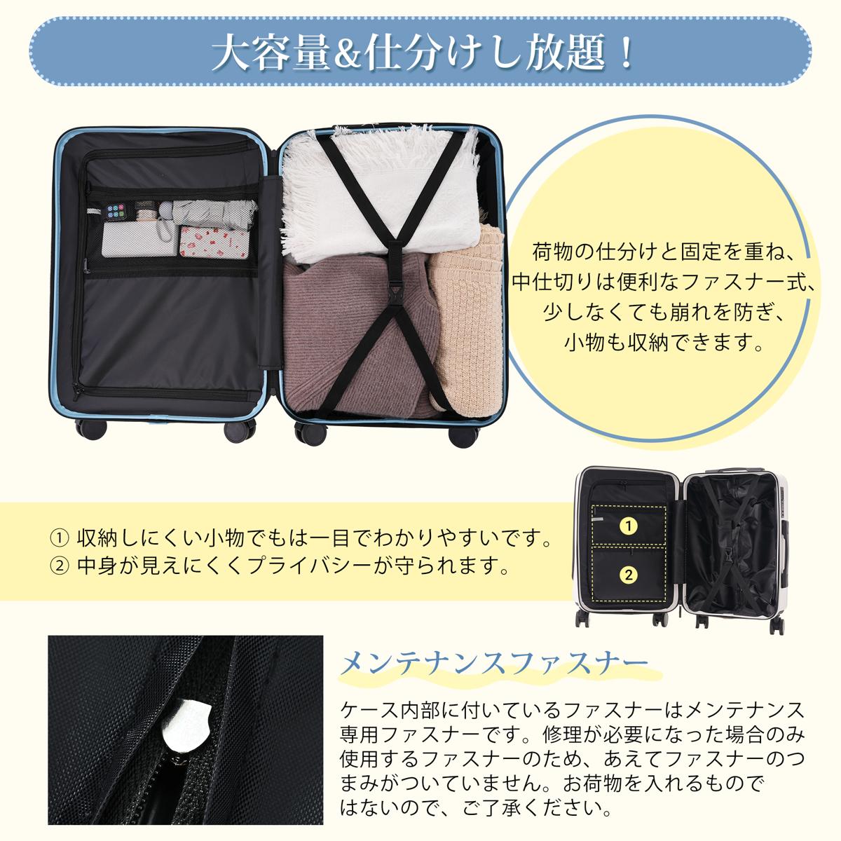 【フロントオープン】立てたまま荷物の出し入れができる便利なフロントオープンスーツケースです。15インチまでパソコンやタブレット、パスポートなど荷物に合わせた細かなポケットがあり、空港や新幹線の中、旅の途中でも、前ポケットから出したいものを簡単に取り出すことができ、子連れの方やビジネスシーンでも活躍しています。ご注意 ①※Sサイズのみ、MとLサイズはフロントオープン仕様を付属していません。②※フロントオープン部分からメイン収納部分の荷物は取り出せません。