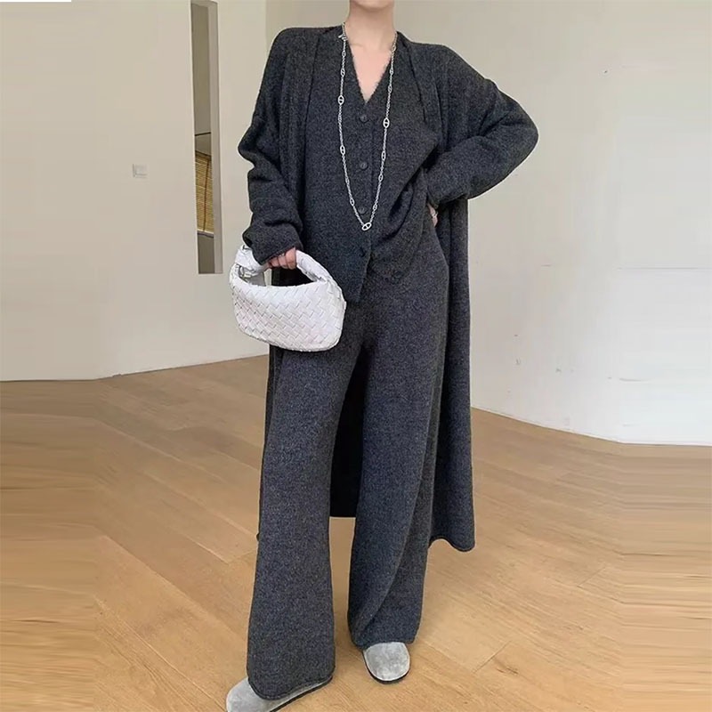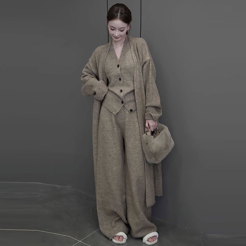 ニット セットアップ レディース 秋冬 きれいめ カジュアル 上下セット パンツスーツ 重ね着 3点セット トップス ベスト セーター ワイドパンツ カーディガン アウター 暖か 長袖 レイヤード風