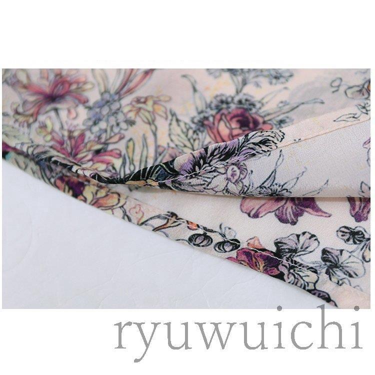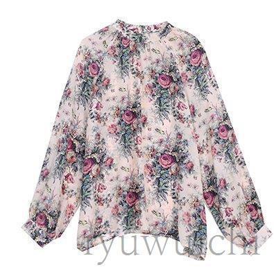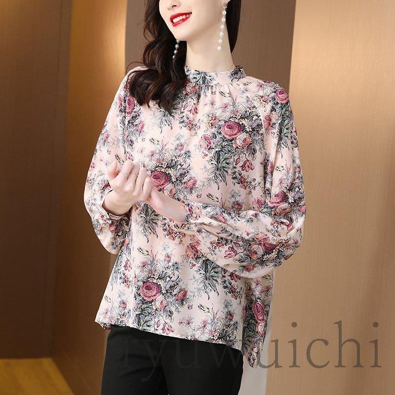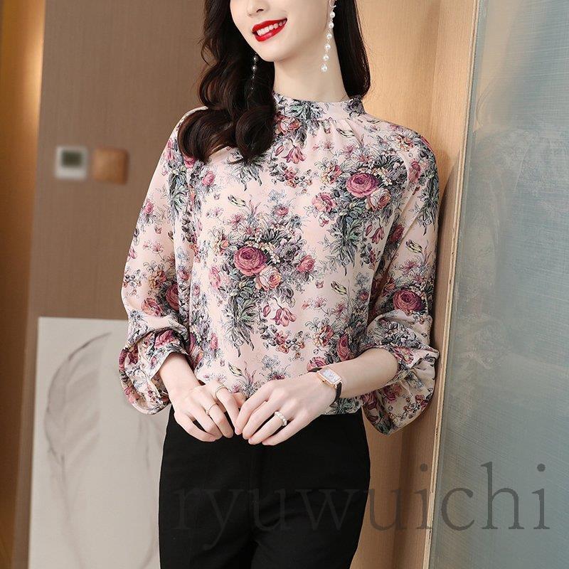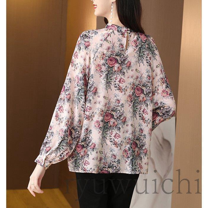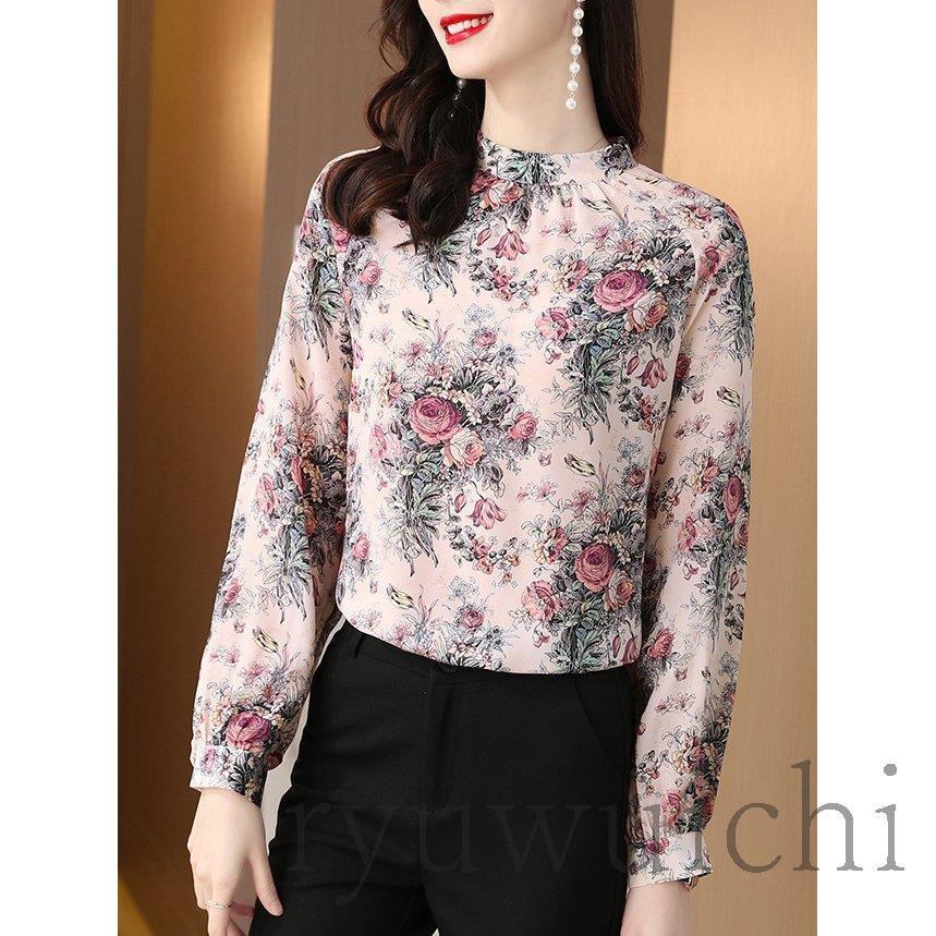 ブラウス シャツ トップス 長袖 柄 総柄 花柄 スタンドカラー 爽やか ふんわり 大人フェミニン 高見え ボタン ホワイト レッド 清楚 可愛い