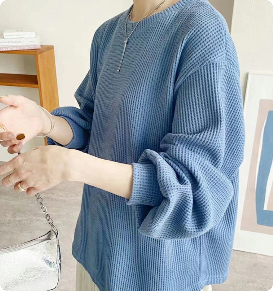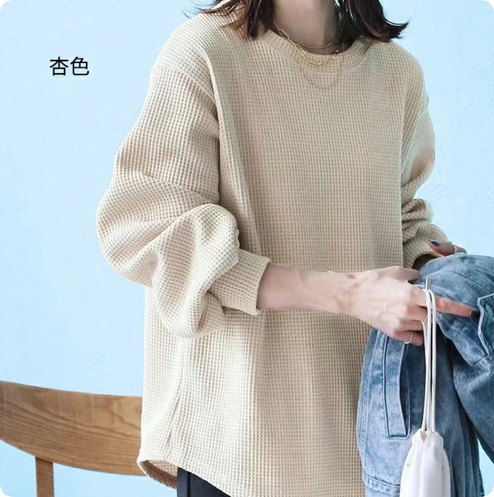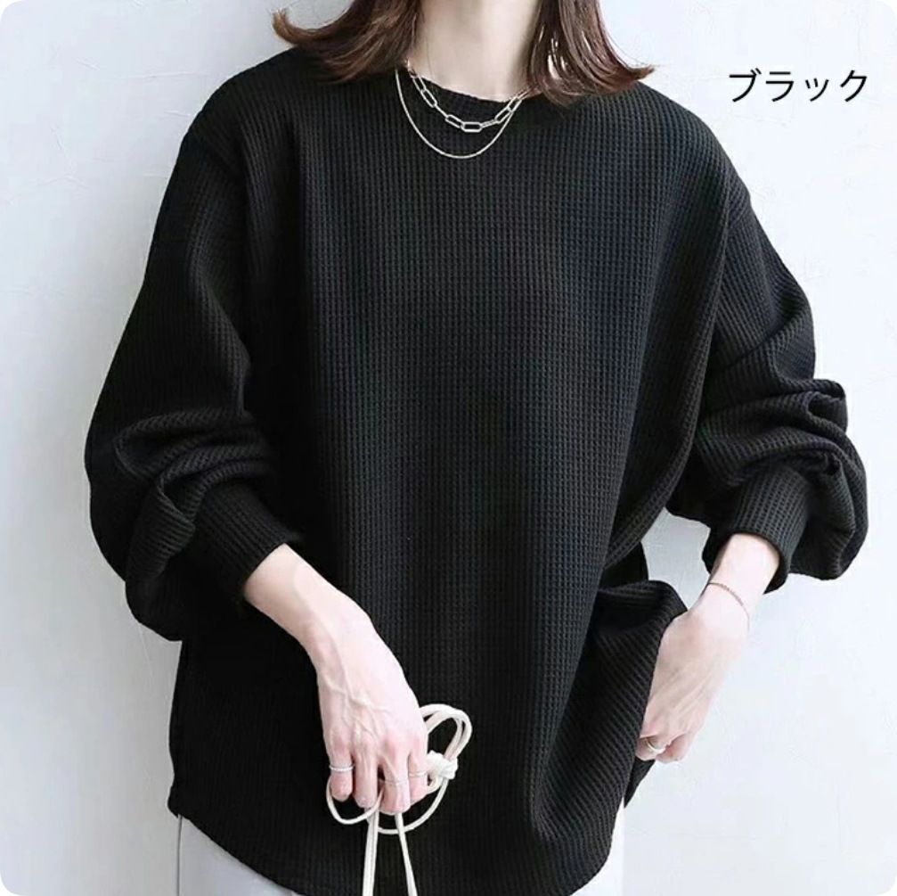 ワッフル ニット プルオーバー レディース サーマル カットソー ワッフル ロンT トップス 無地 長袖 Tシャツ ロング ロングTシャツ チュニック きれいめ 丸首 お洒落