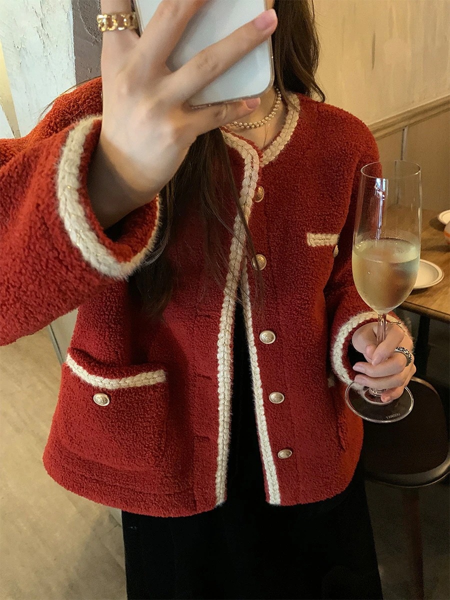 アウター 冬 ジャケット 赤い子羊ぬいぐるみ女性のデザインセンスニッチ2023秋冬の新しいスタイルプラスベルベットと厚い テーラードジャケット