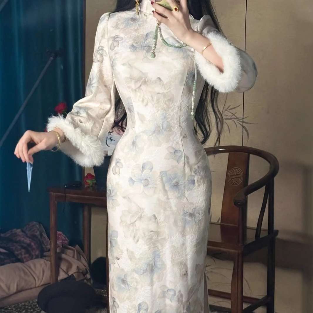 2024中国風の新しい改善された穏やかな秋冬スタイル毎日肥厚逆大袖チャイナドレス青茶 その他 スカート