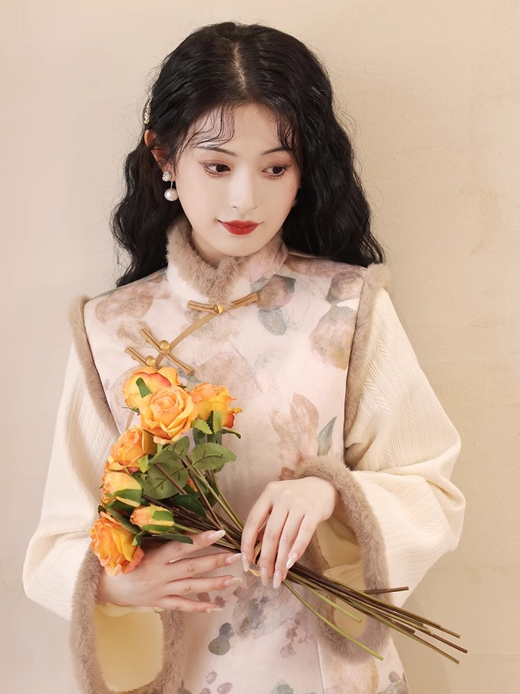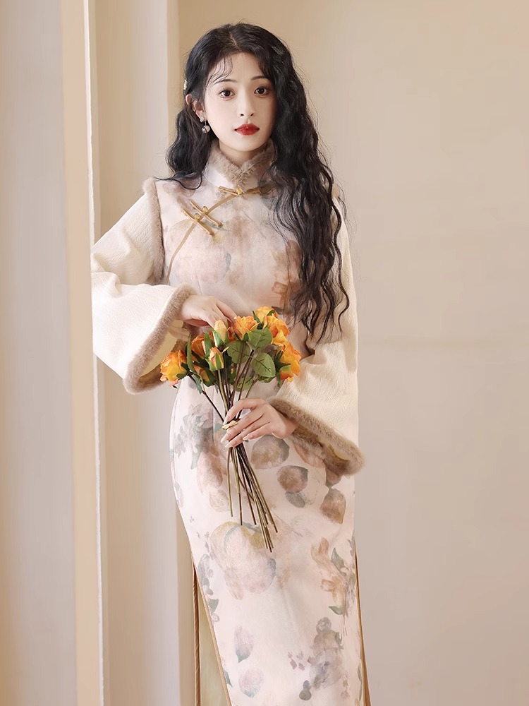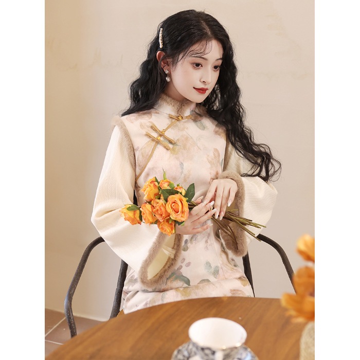 新しい中国風の女性の冬のチャイナドレス 2024 新しい改善された秋冬スタイル長袖プラスベルベット肥厚レトロスタイル高貴な気質 その他 スカート