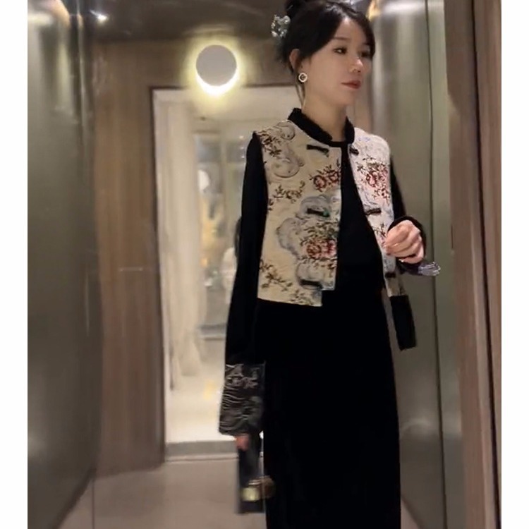 新しい中国風チャイナドレス威厳のある女性の中国風ベスト黒ベルベットドレス今年人気のツーピーススーツ冬 その他 スカート