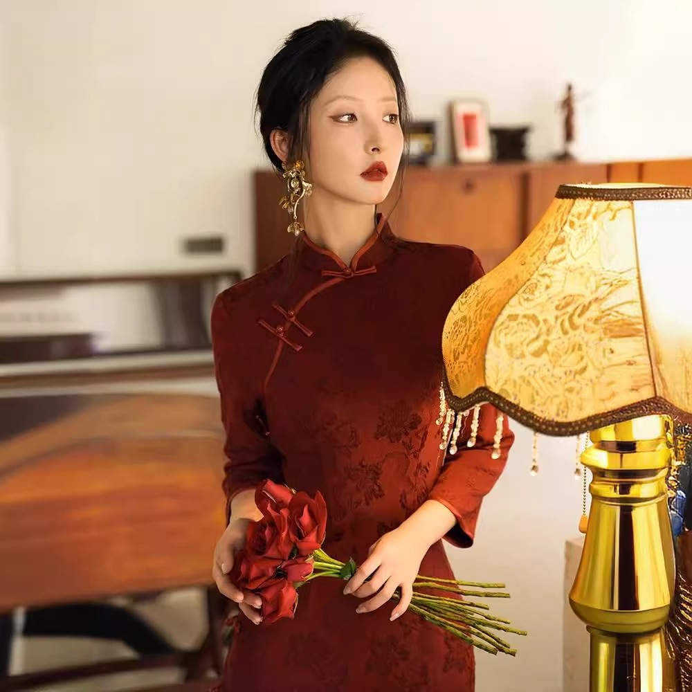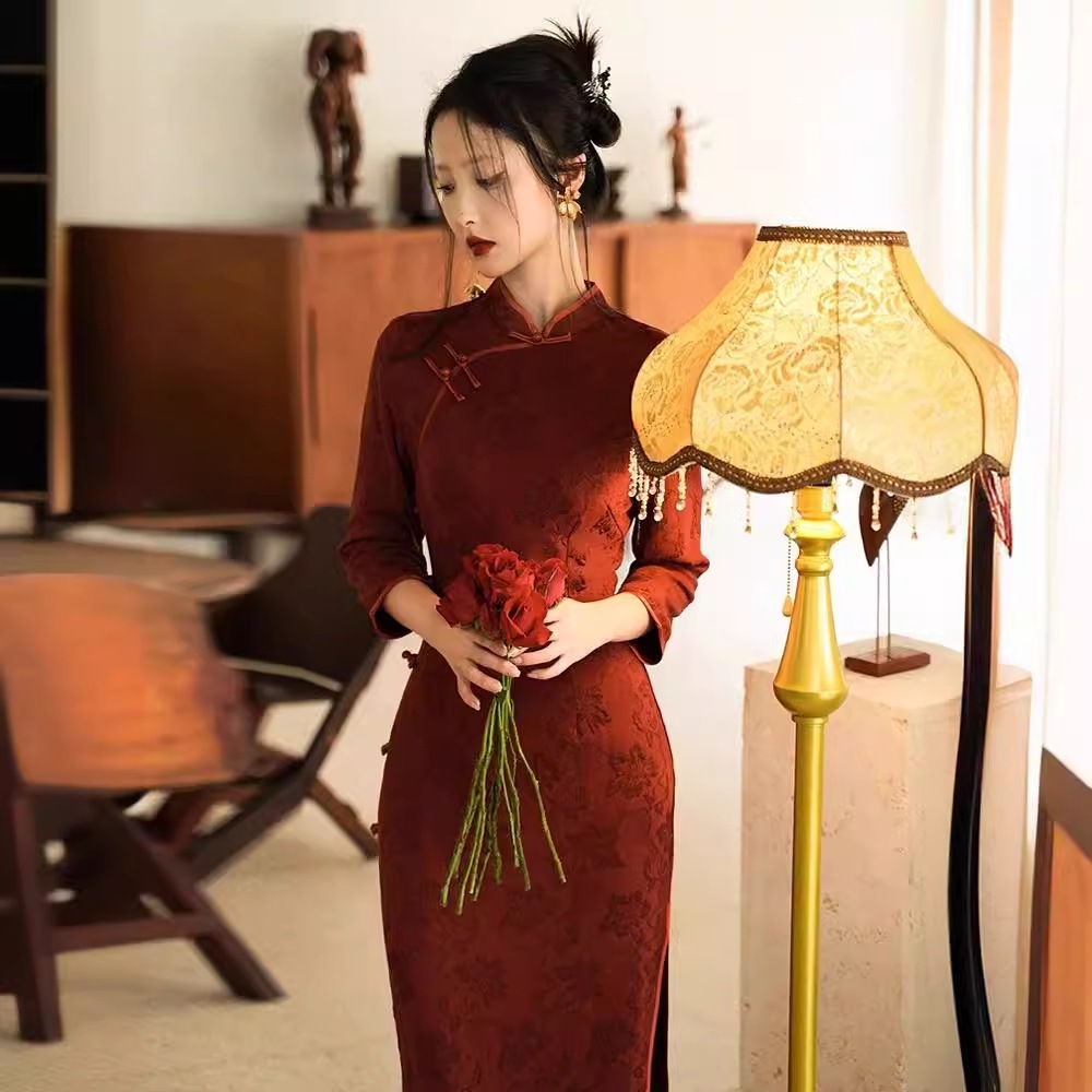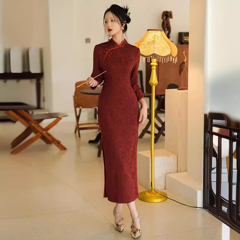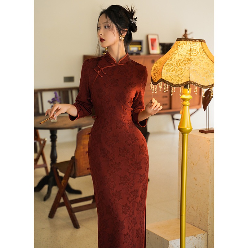 2024新しいダークパターンバーガンディチャイナドレス若い新しい中国風中国風スリムフィットドレス その他 スカート