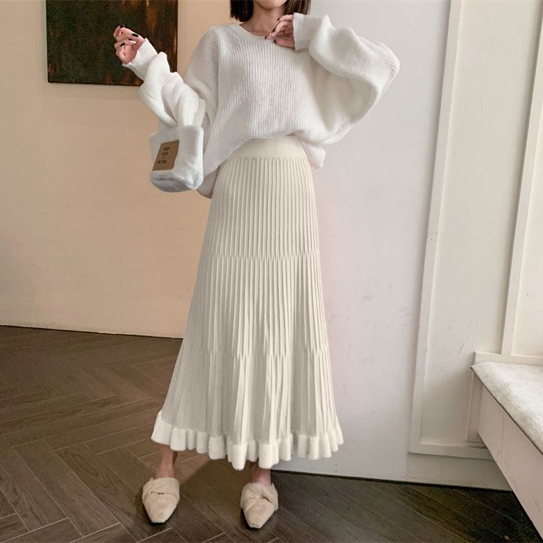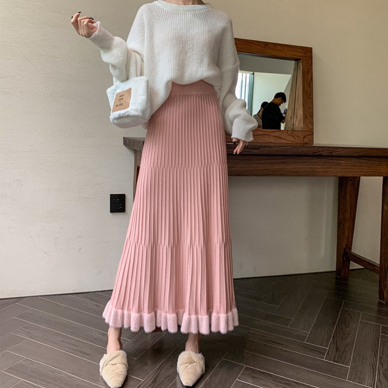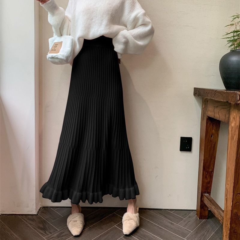 韓国ファッションレディース着痩せスカート 秋冬 ロングプリーツスカート ニットスカートゆったりハイウエストプリーツスカート ロングスカート