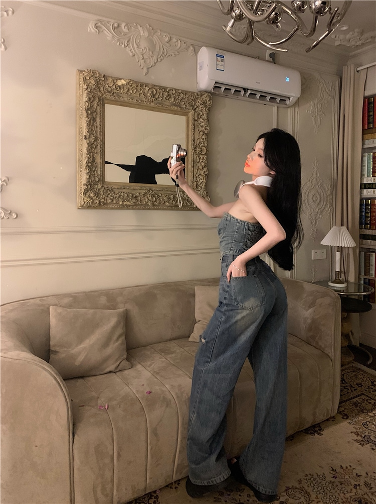 デニム ハイウエスト ワイドパンツ セットアップ ショート チューブトップ デニムパンツ ジーンズ ジーパン クラッシュド ダメージ ウォッシュ加工 ゆるダボ ストリート