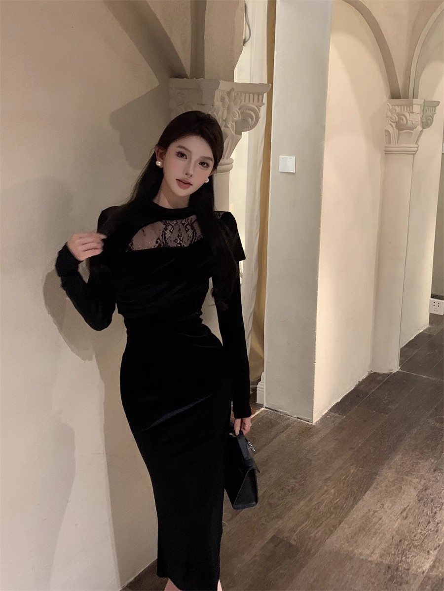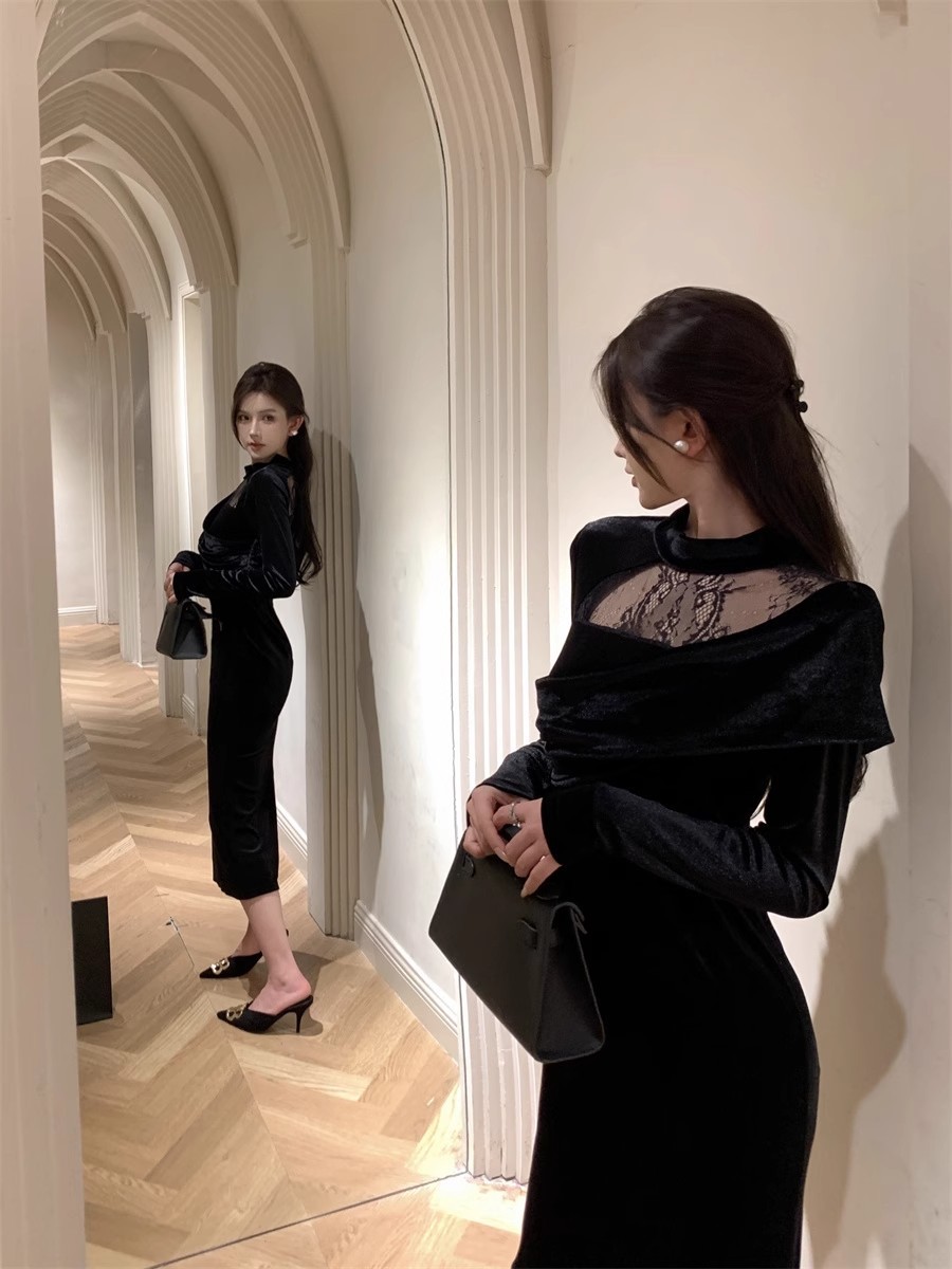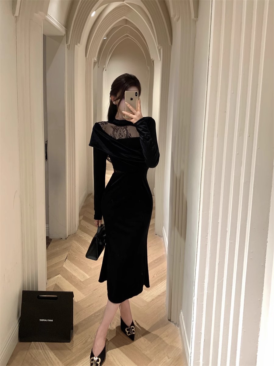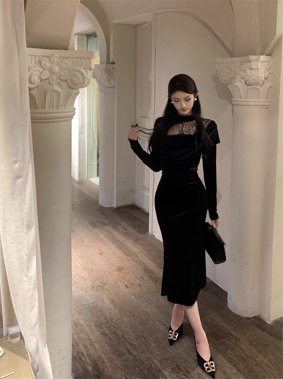 御姉様ヘップバーン風長袖ベルベットワンピース秋冬純欲レース宴会令嬢気質ドレスリトルブラックスカート女 長袖ロング マキシ丈ワンピ