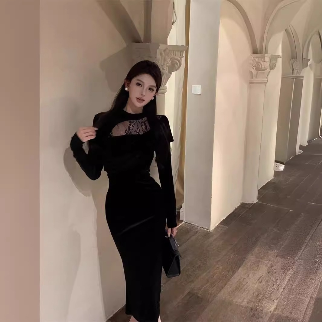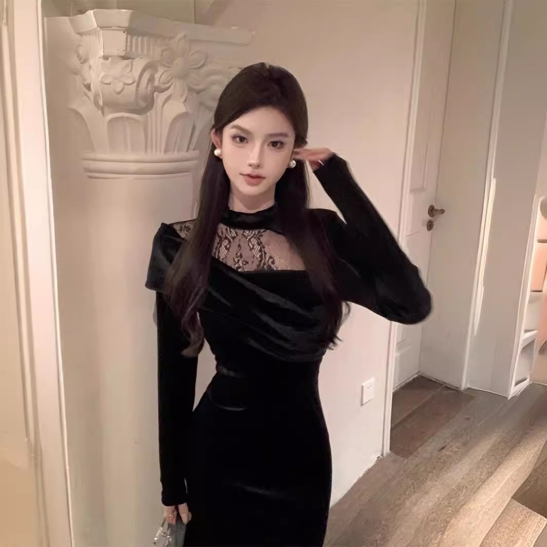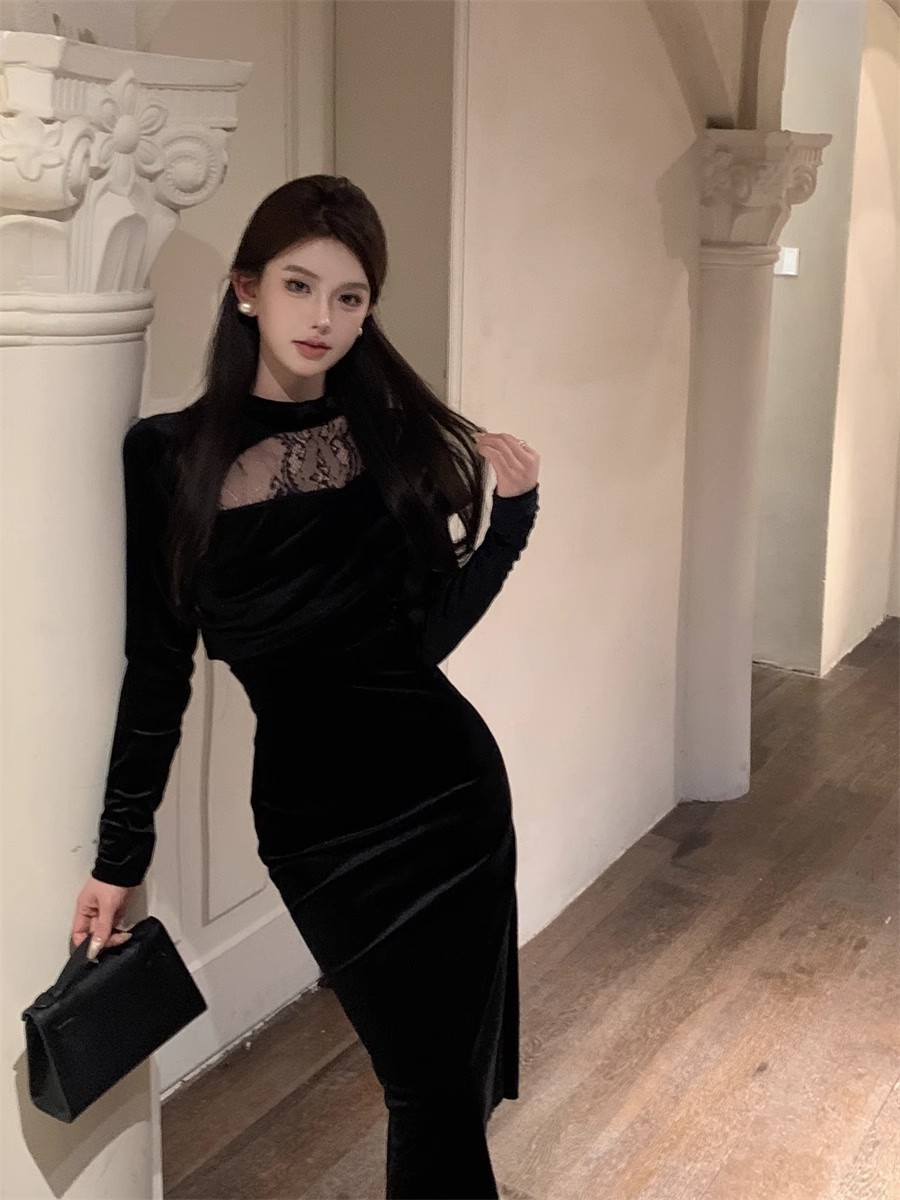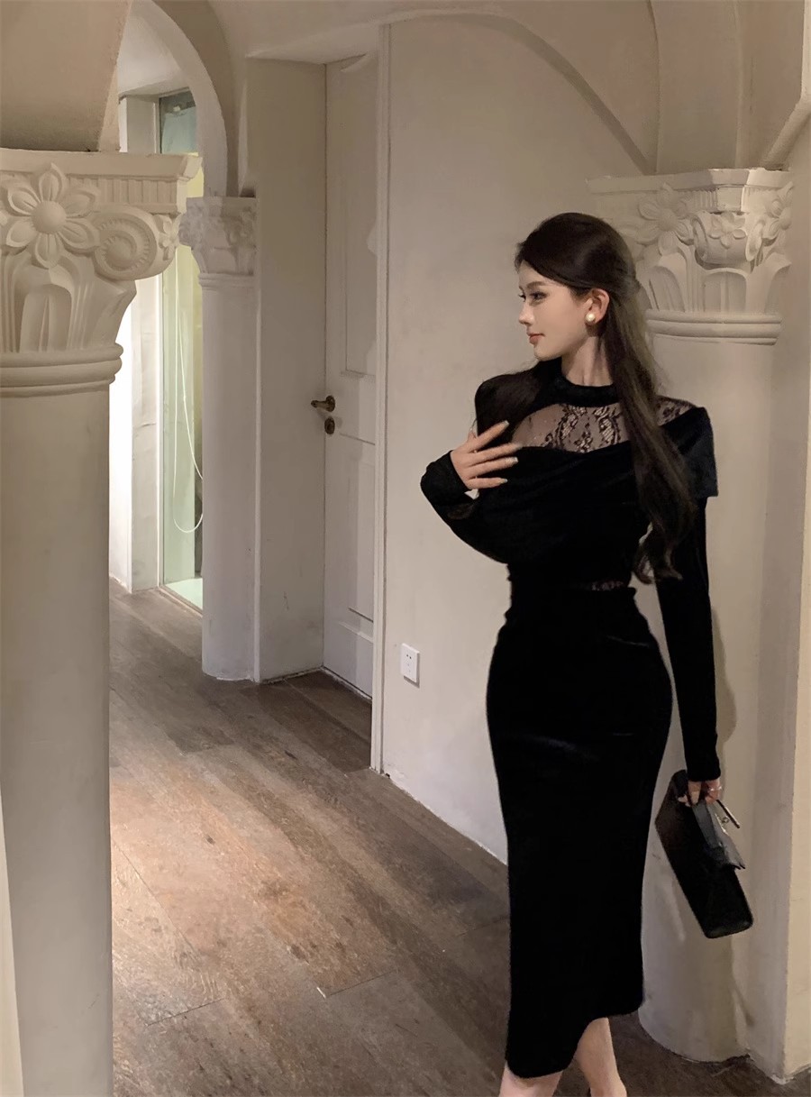 御姉様ヘップバーン風長袖ベルベットワンピース秋冬純欲レース宴会令嬢気質ドレスリトルブラックスカート女 長袖ロング マキシ丈ワンピ