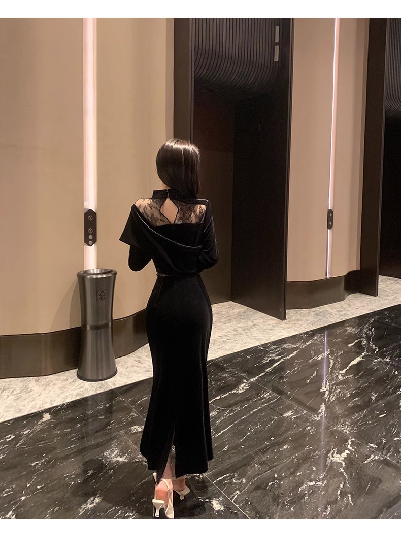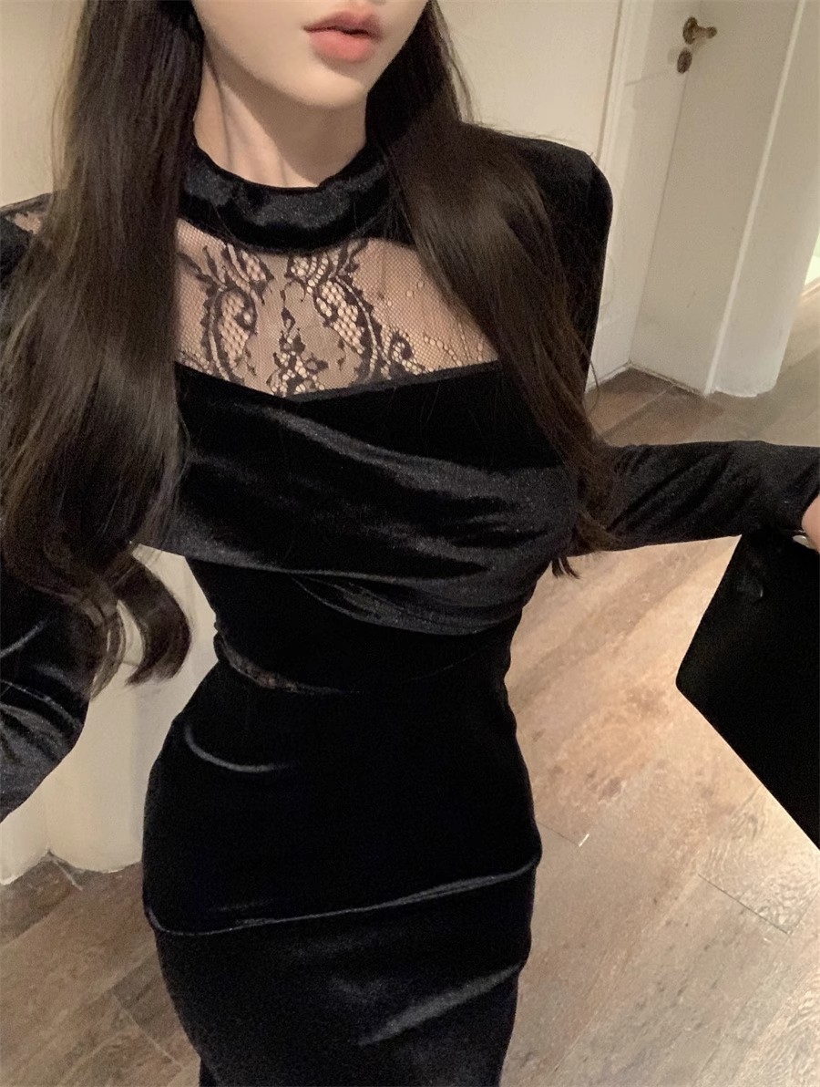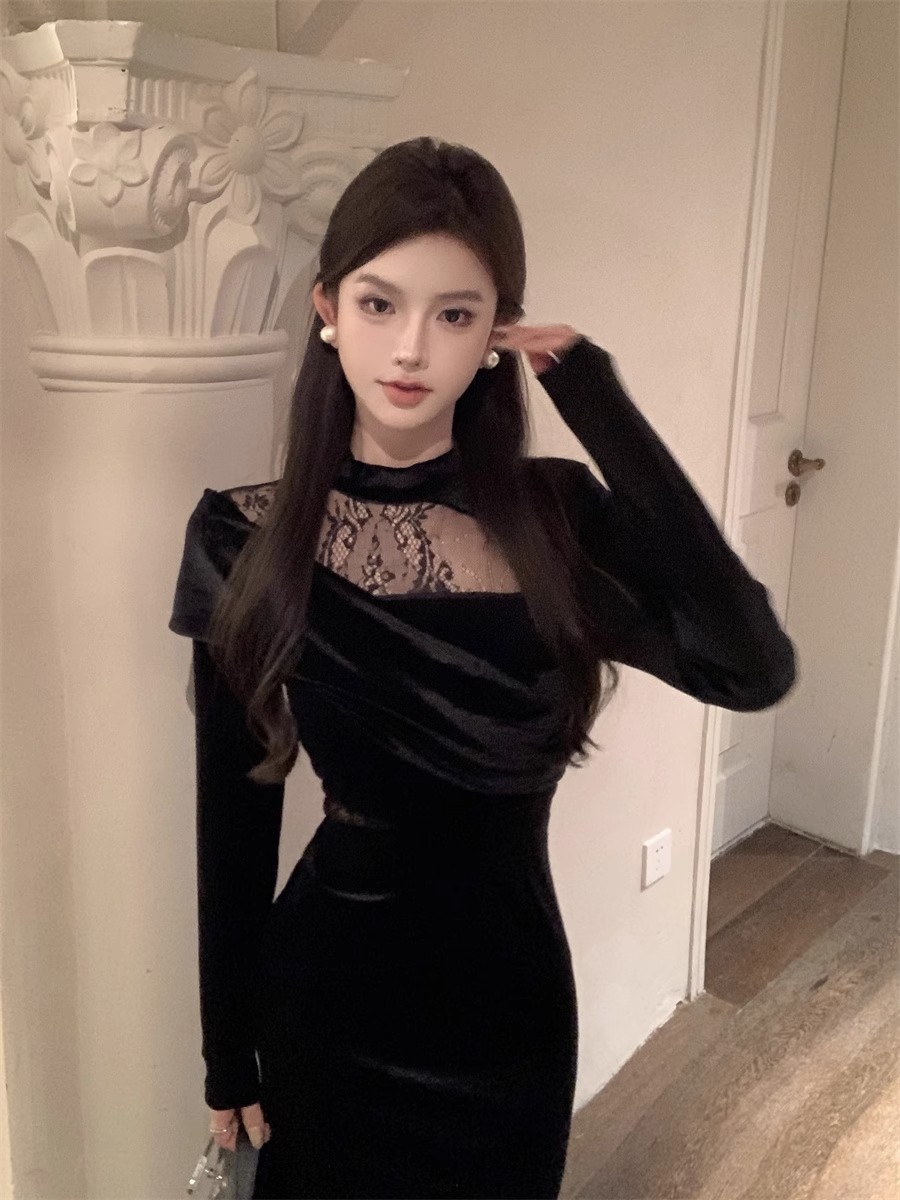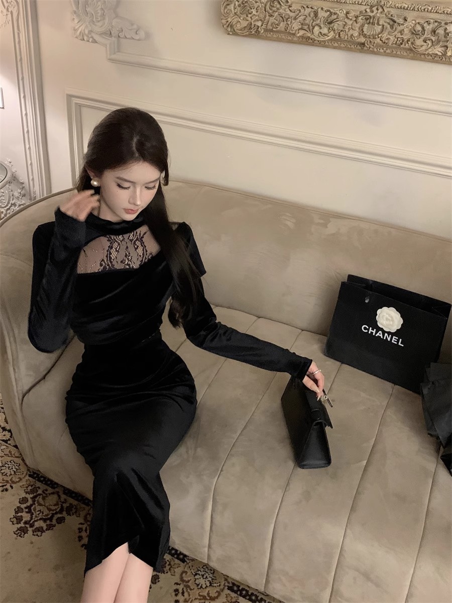 御姉様ヘップバーン風長袖ベルベットワンピース秋冬純欲レース宴会令嬢気質ドレスリトルブラックスカート女 長袖ロング マキシ丈ワンピ