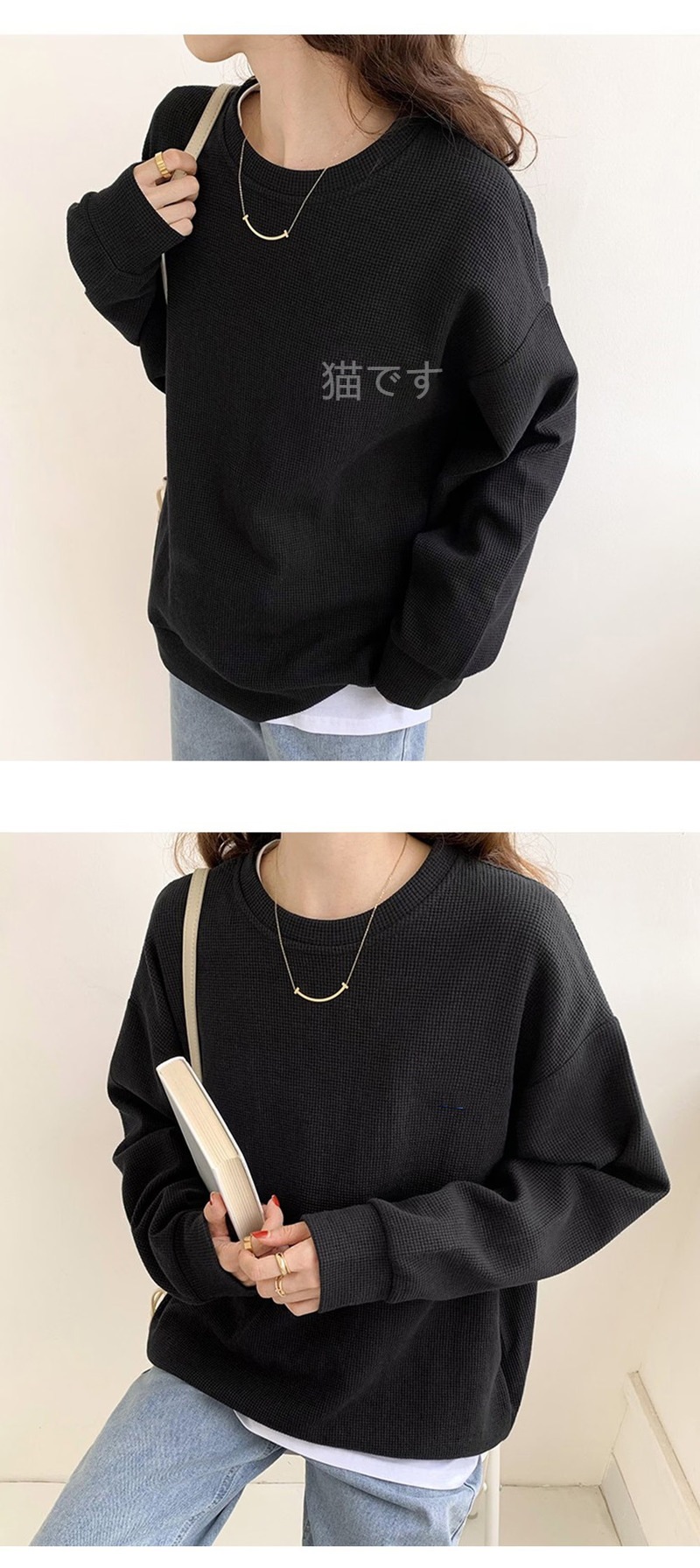 ラウンドネック 長袖 ボーダー ニット メロウ フリル トップス 無地 かわいい シンプル カットソー ツートーン おしゃれ メロー モノトーン 春秋冬 ラウンドネック