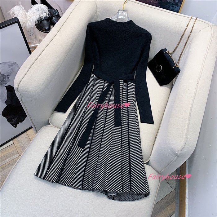 ニットワンピース レディース 20代 30代40代 春秋冬 きれいめ 膝丈ワンピース 長袖 リボン Aラインプリーツスカート ニット 結婚式ドレス 通勤 ロング 着痩せ オシャレ