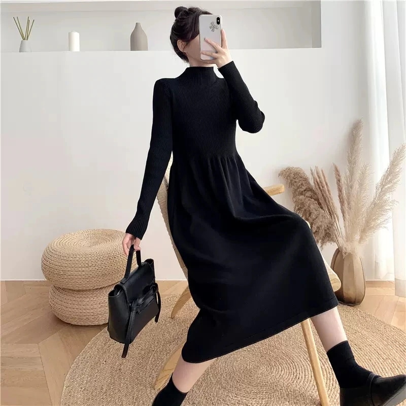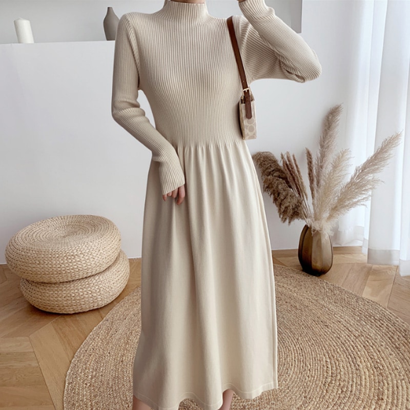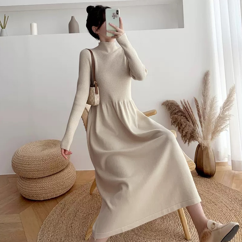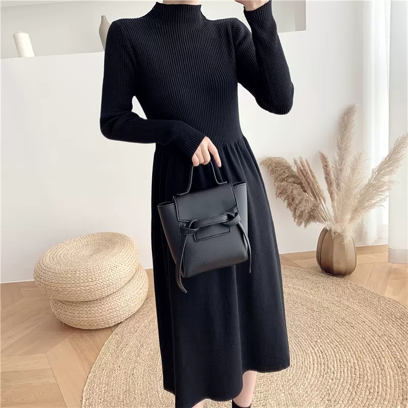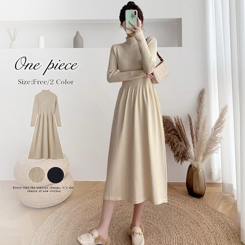 ワンピース ニットワンピース ハイネック切替えリブニットワンピース ニット ワンピース リブニット ハイネック 秋冬 長袖 フレアワンピース ミモレ丈