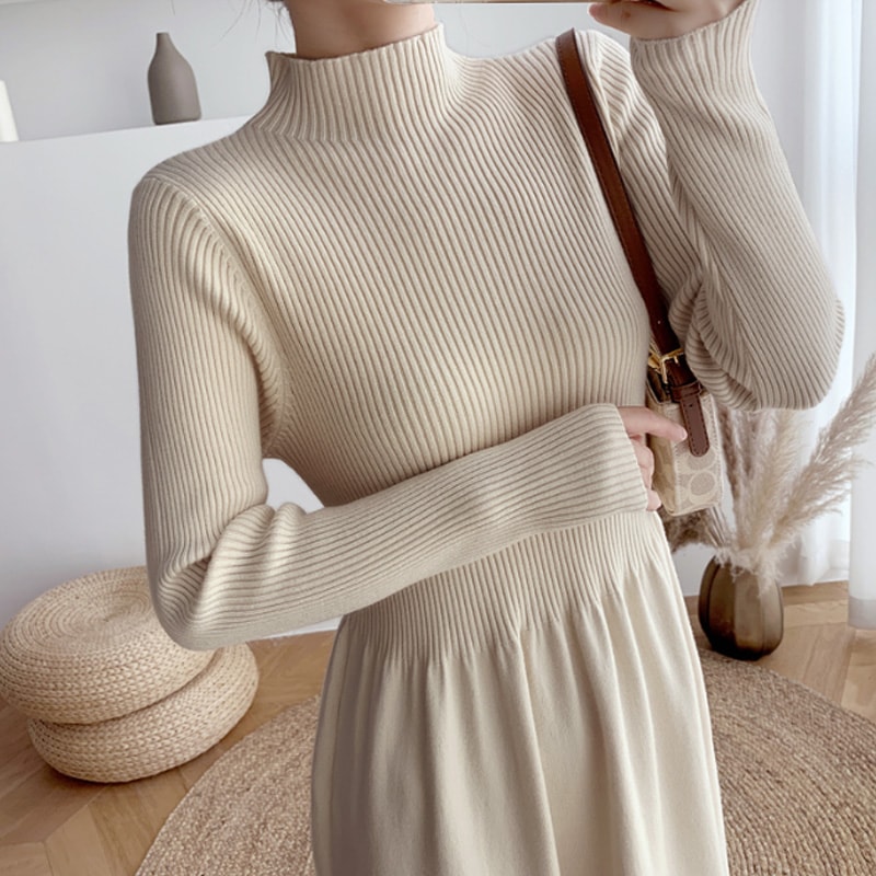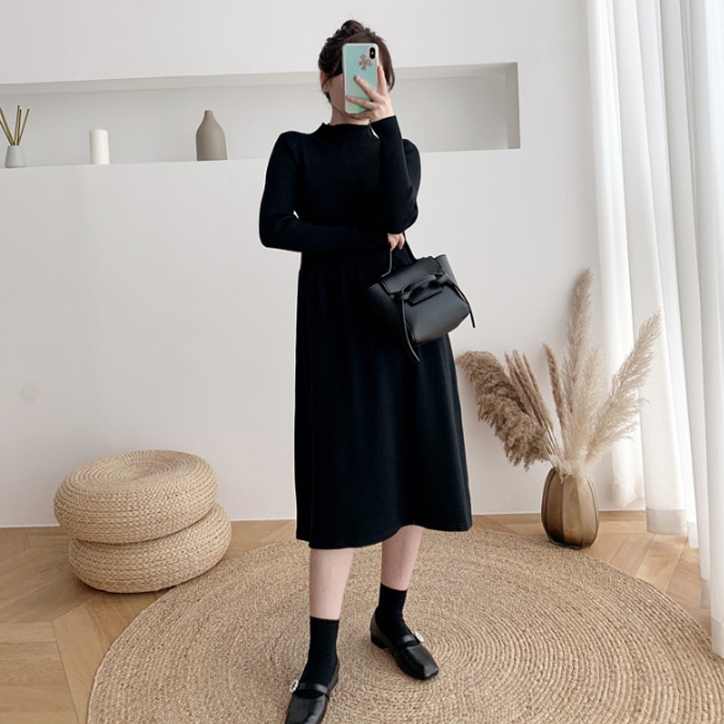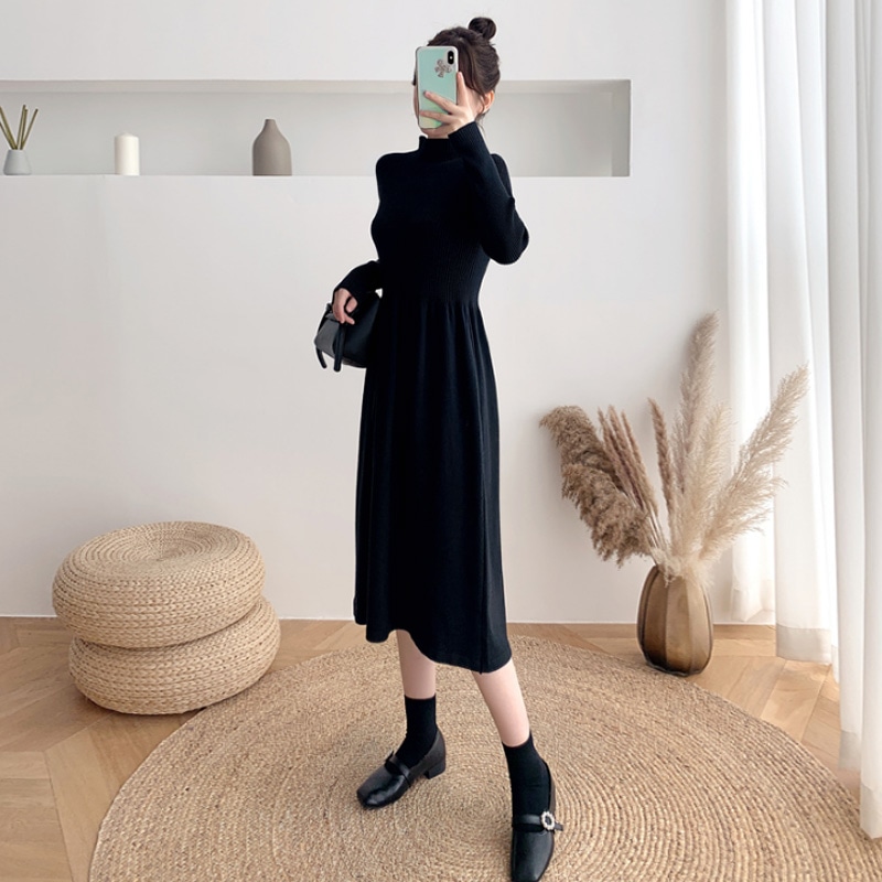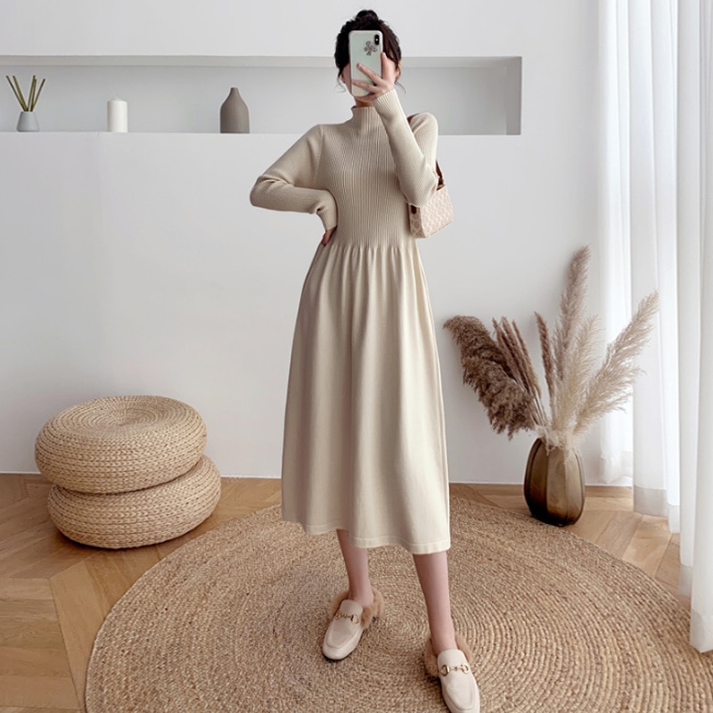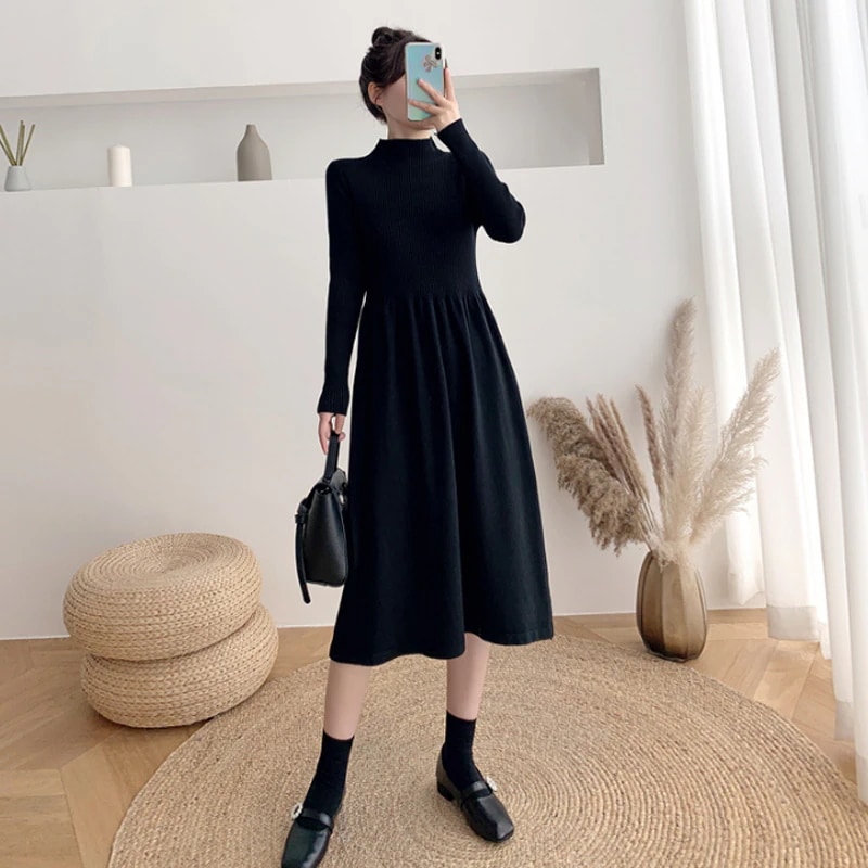 ワンピース ニットワンピース ハイネック切替えリブニットワンピース ニット ワンピース リブニット ハイネック 秋冬 長袖 フレアワンピース ミモレ丈