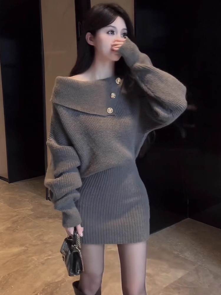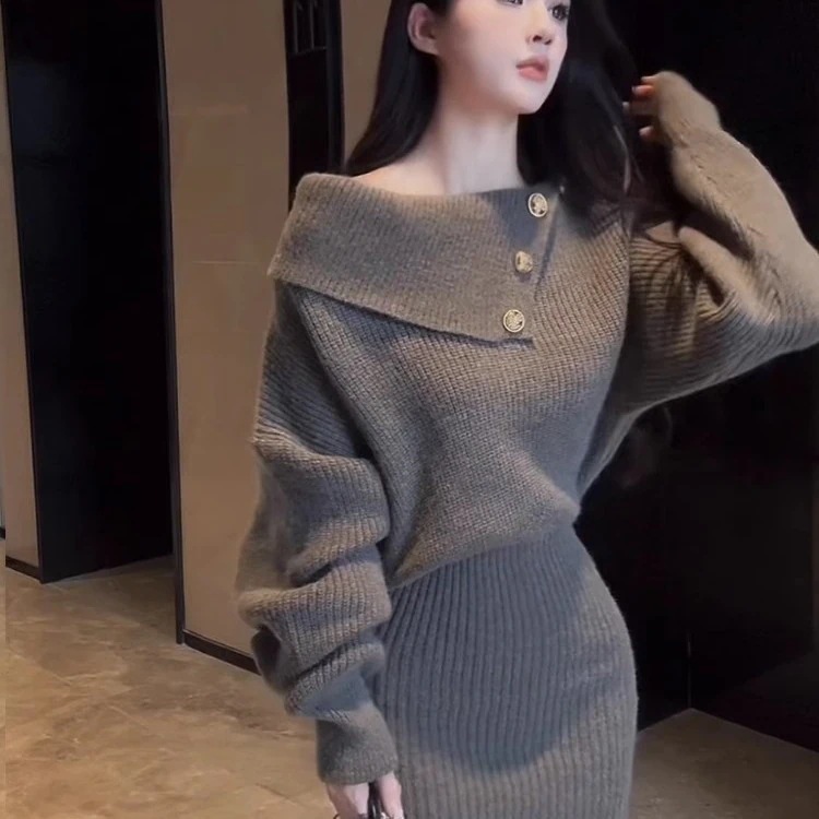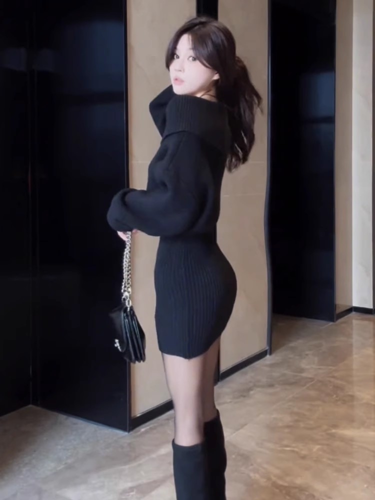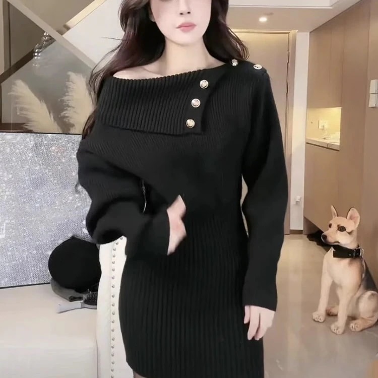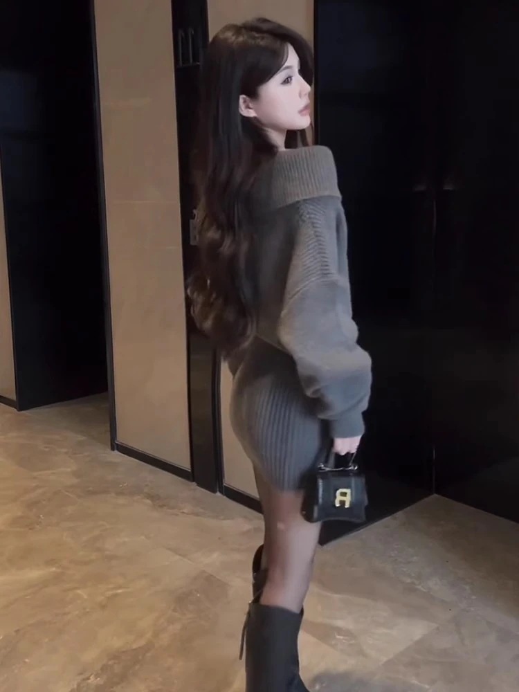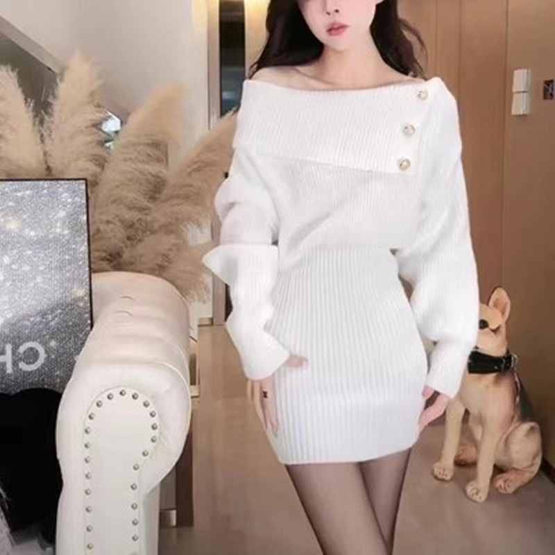 ニット長袖ワンピース 秋冬 韓国 ニットワンピ 新入荷 冬のワンピース 肩出しスリム一文字肩毛スカートヒップスカート ニットワンピース ロングワンピース レディース 韓国 春 秋 冬