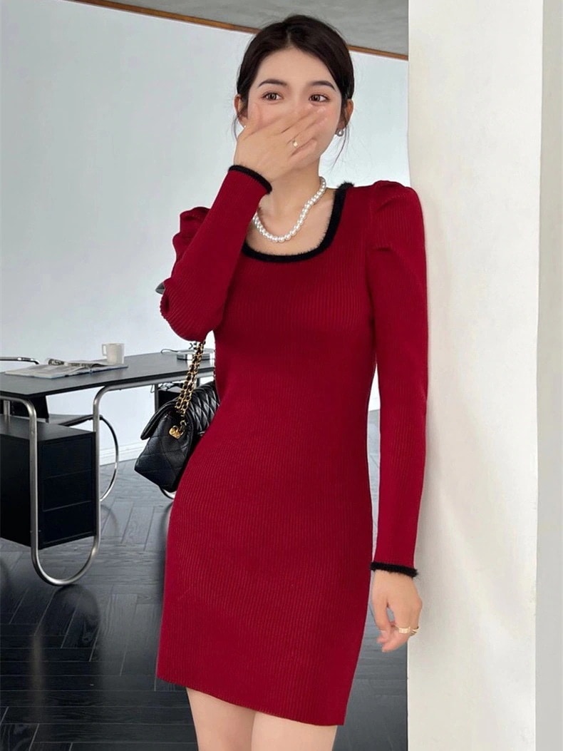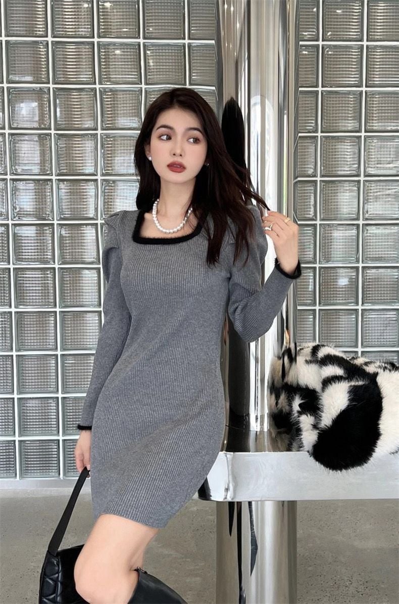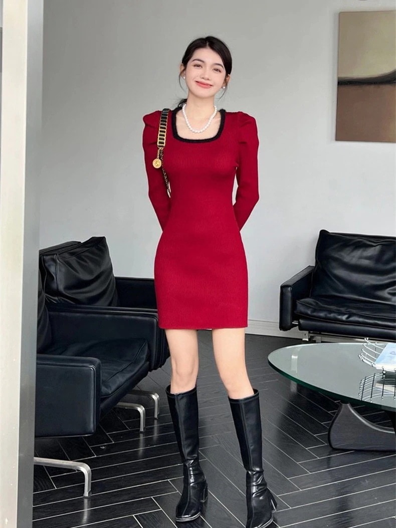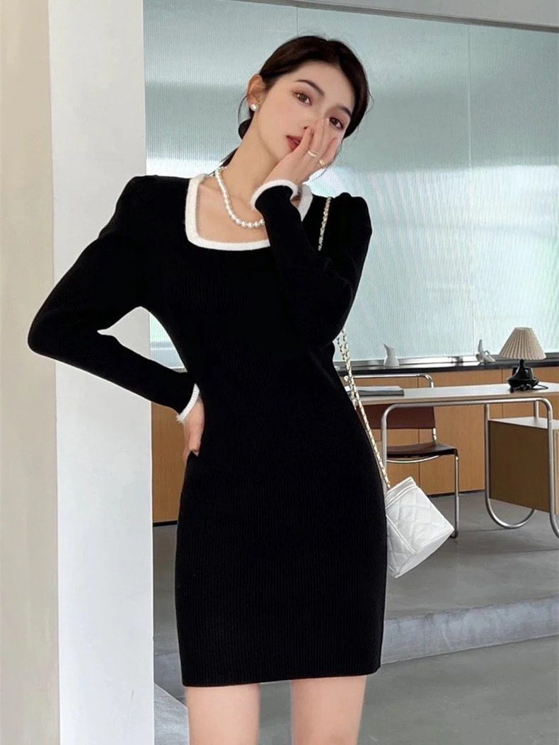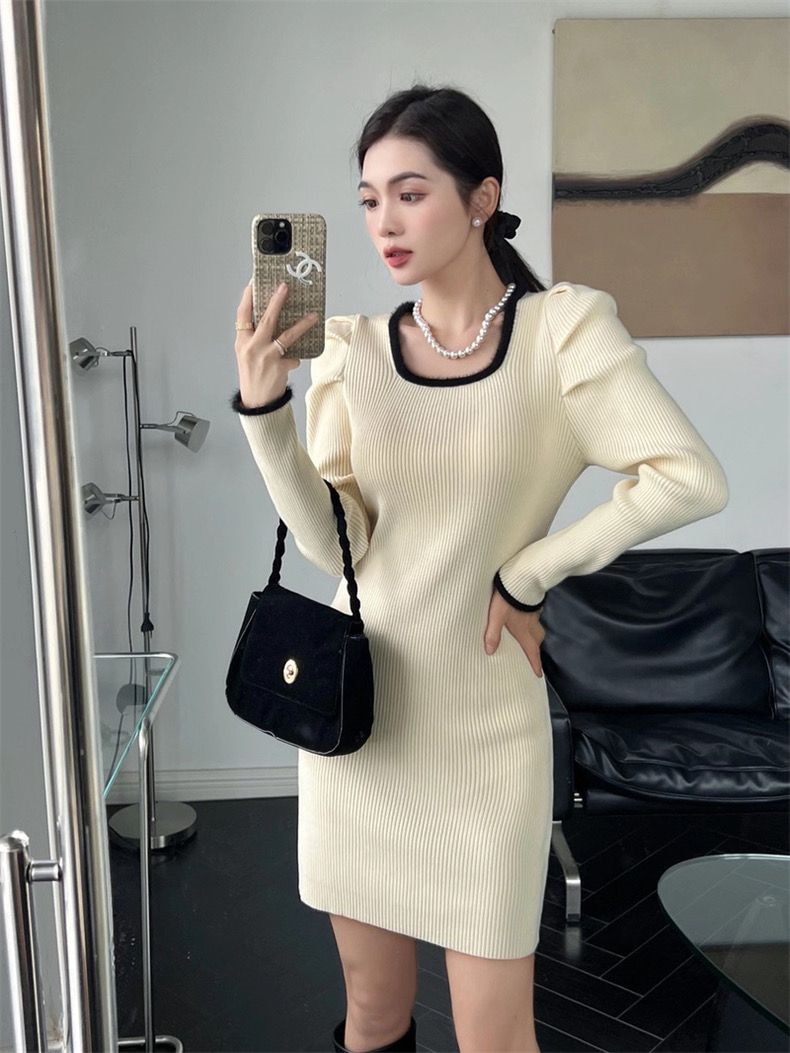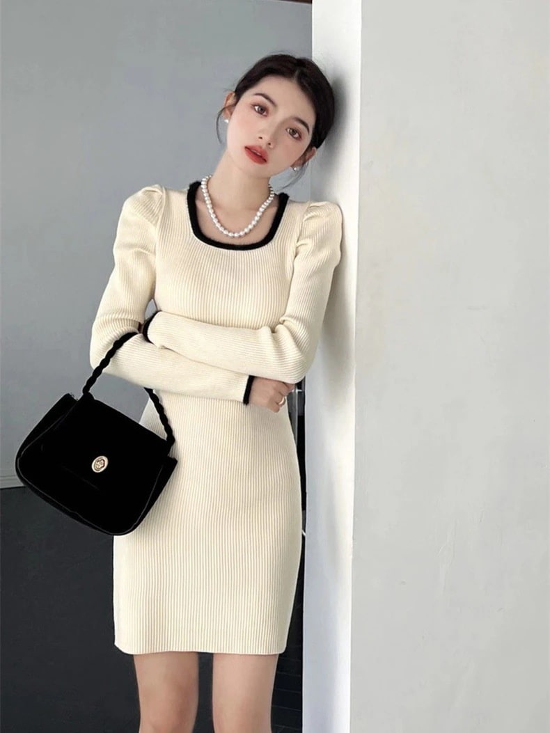ニット長袖ワンピース 秋冬 韓国 ニットワンピ 冬のワンピース 韓国 ニットワンピース 可愛らしい コントラストカラー ワンピース 冬 着痩せ