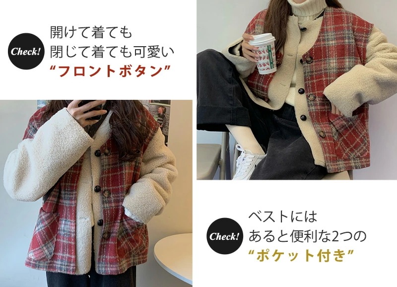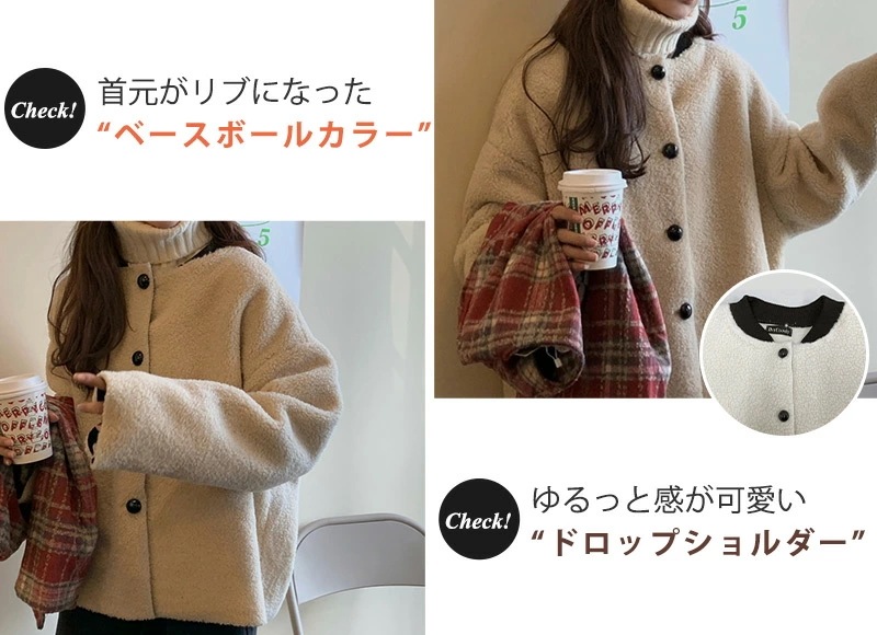 ,,ボア ブルゾン ベスト レディース アウター 秋冬 2点セット アンサンブル レイヤード 厚手 タータンチェック 無地 白 大きいサイズ オーバーサイズ ドロップショルダー ベースボールカラー ポ