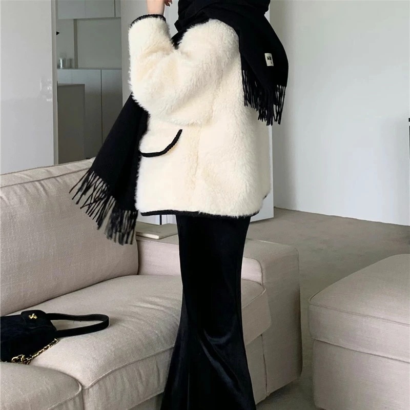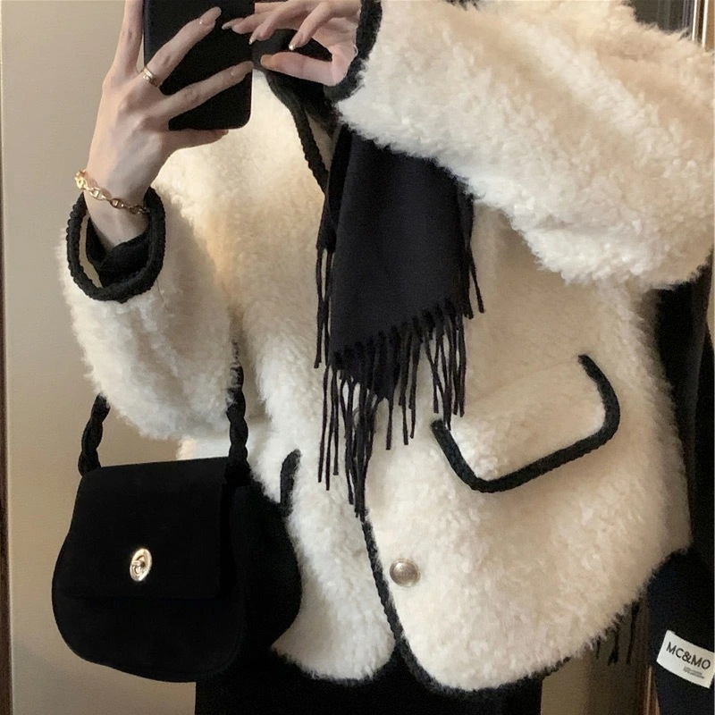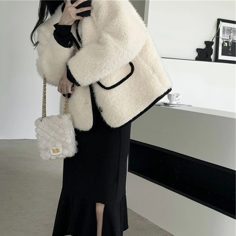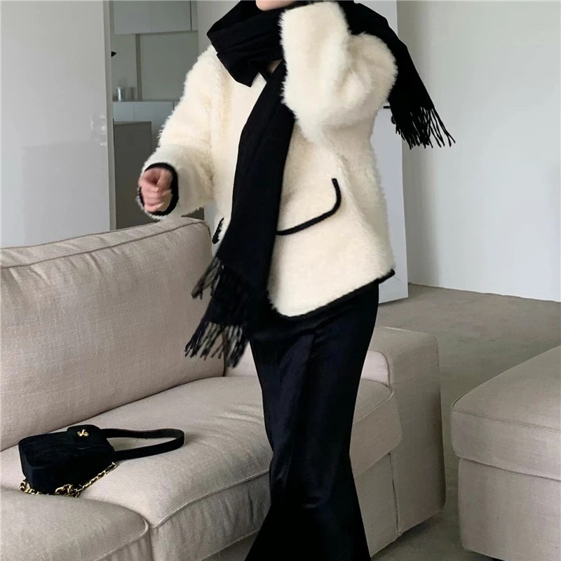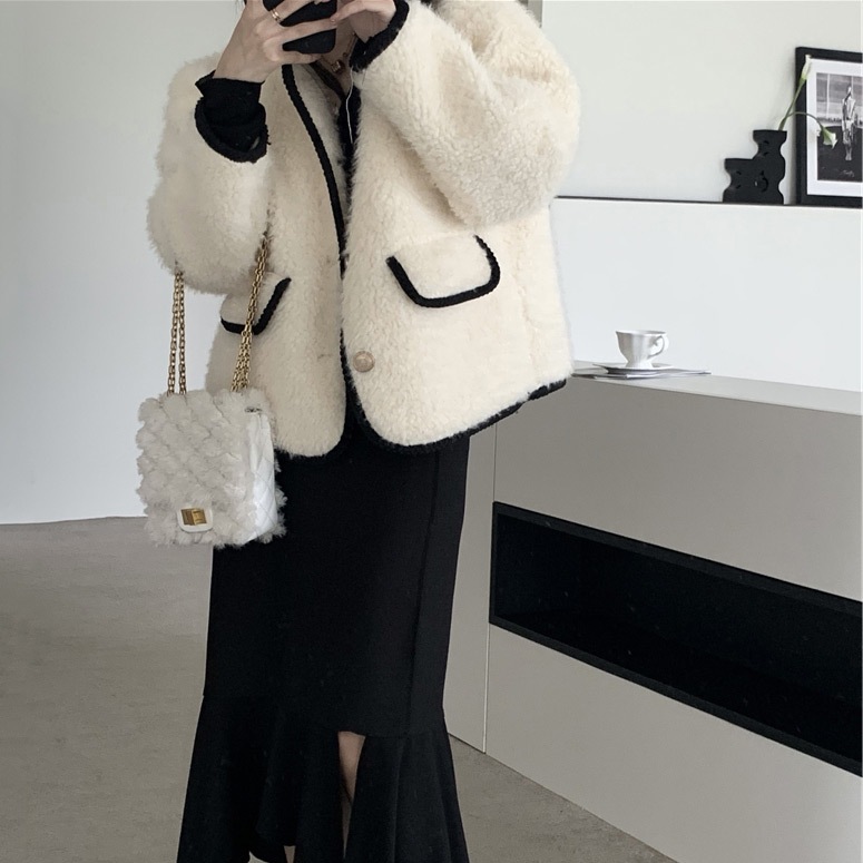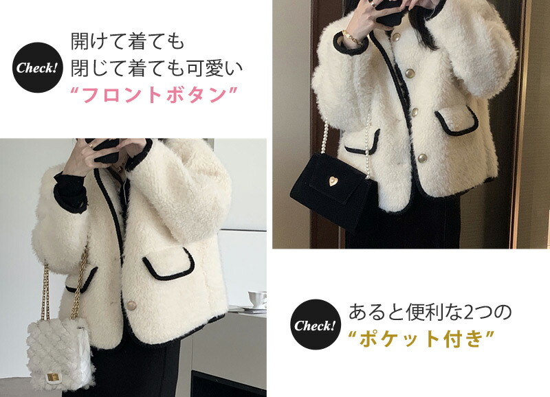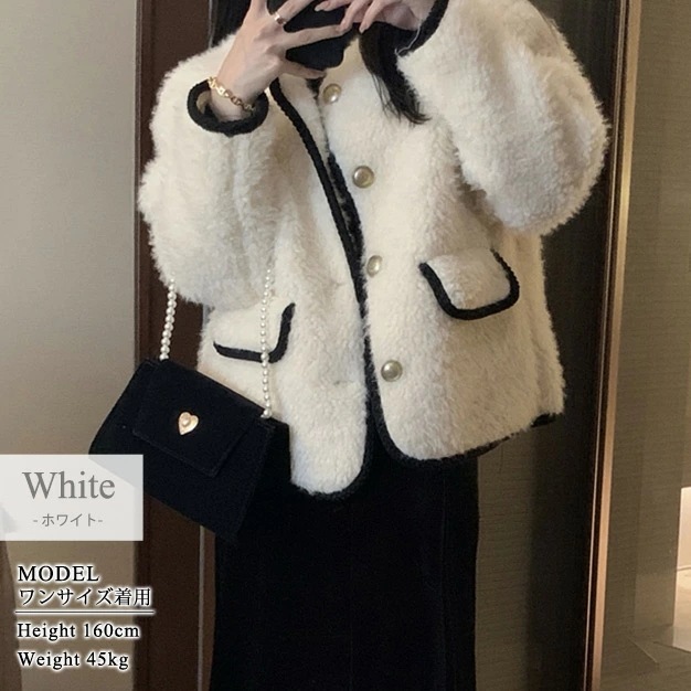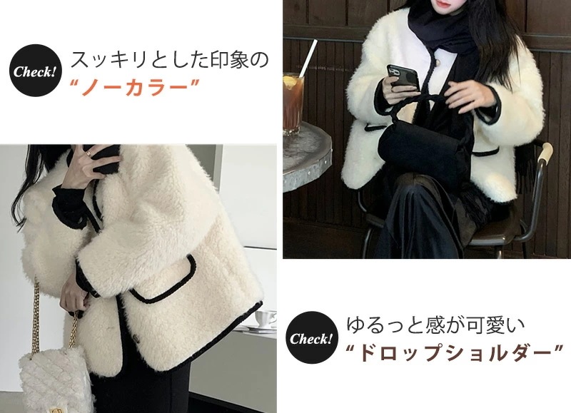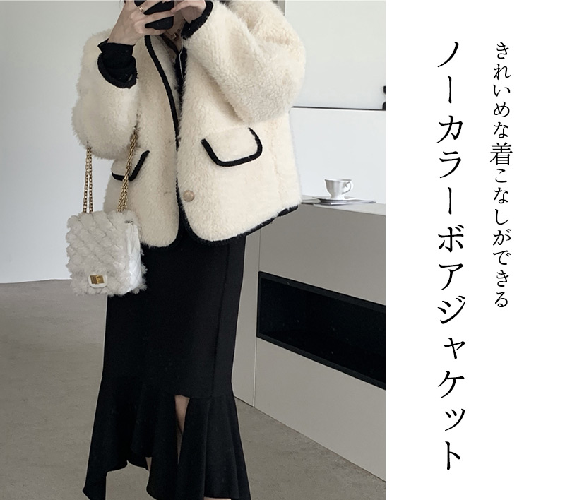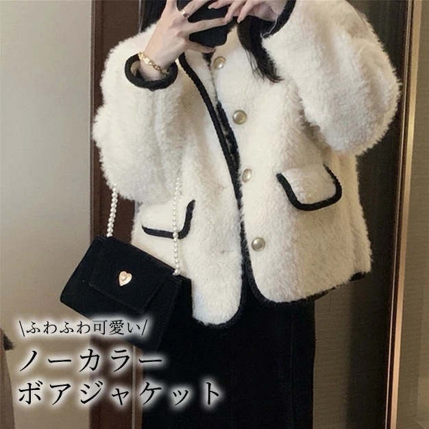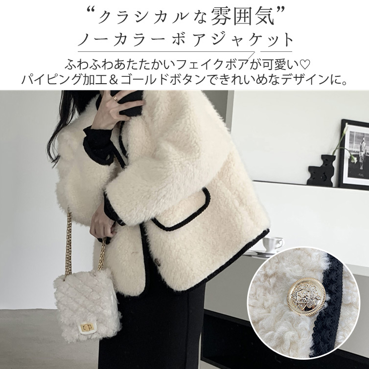 ,,ボアジャケット レディース 秋冬 ノーカラー アウタードロップショルダー フェイクボア ブルゾン 長袖 無地 白 ミディアム丈 パイピング 裏地付き きれいめ シンプル ガーリー レトロ ポケット