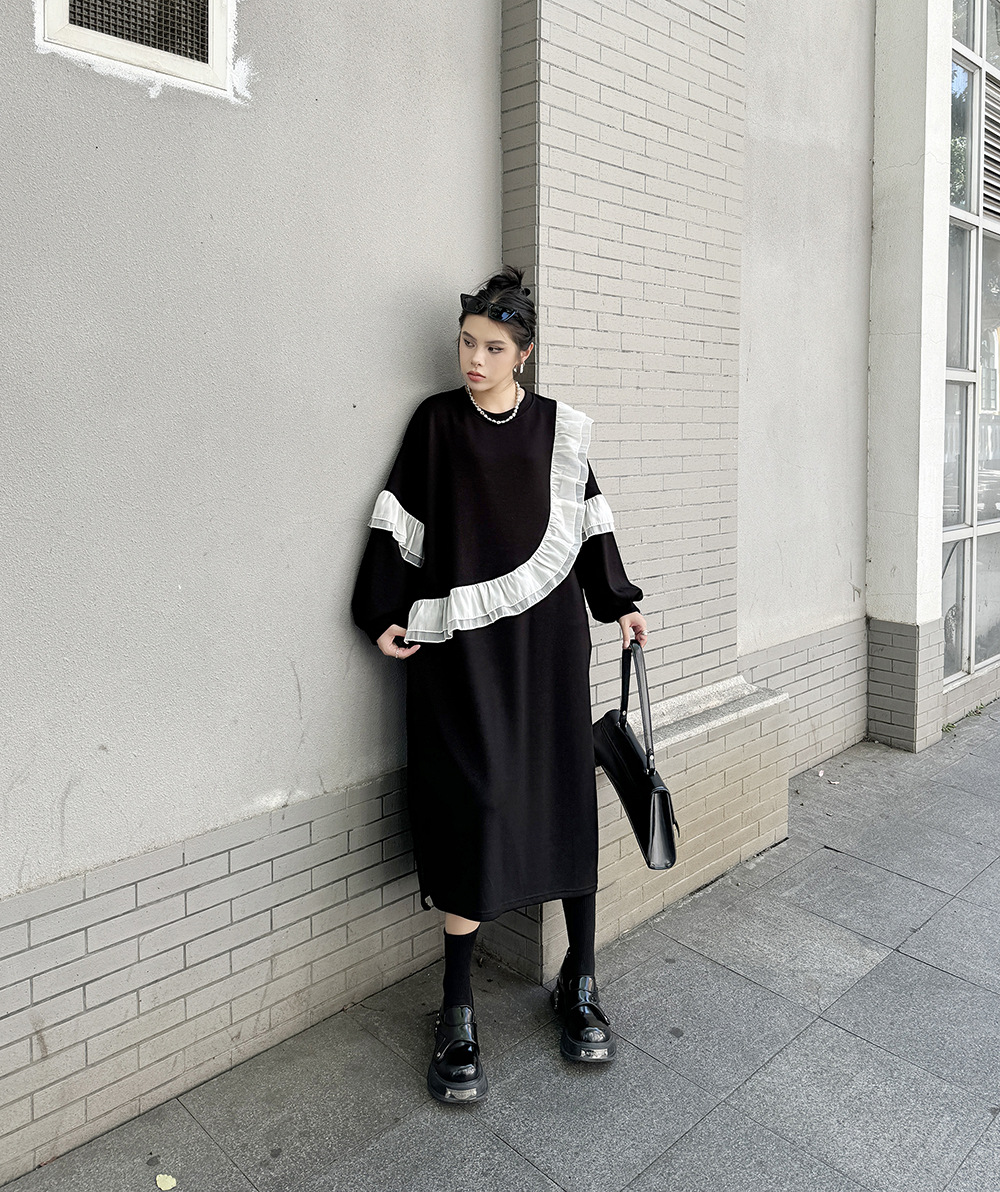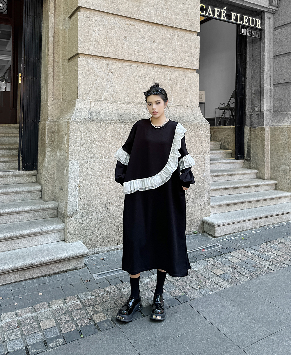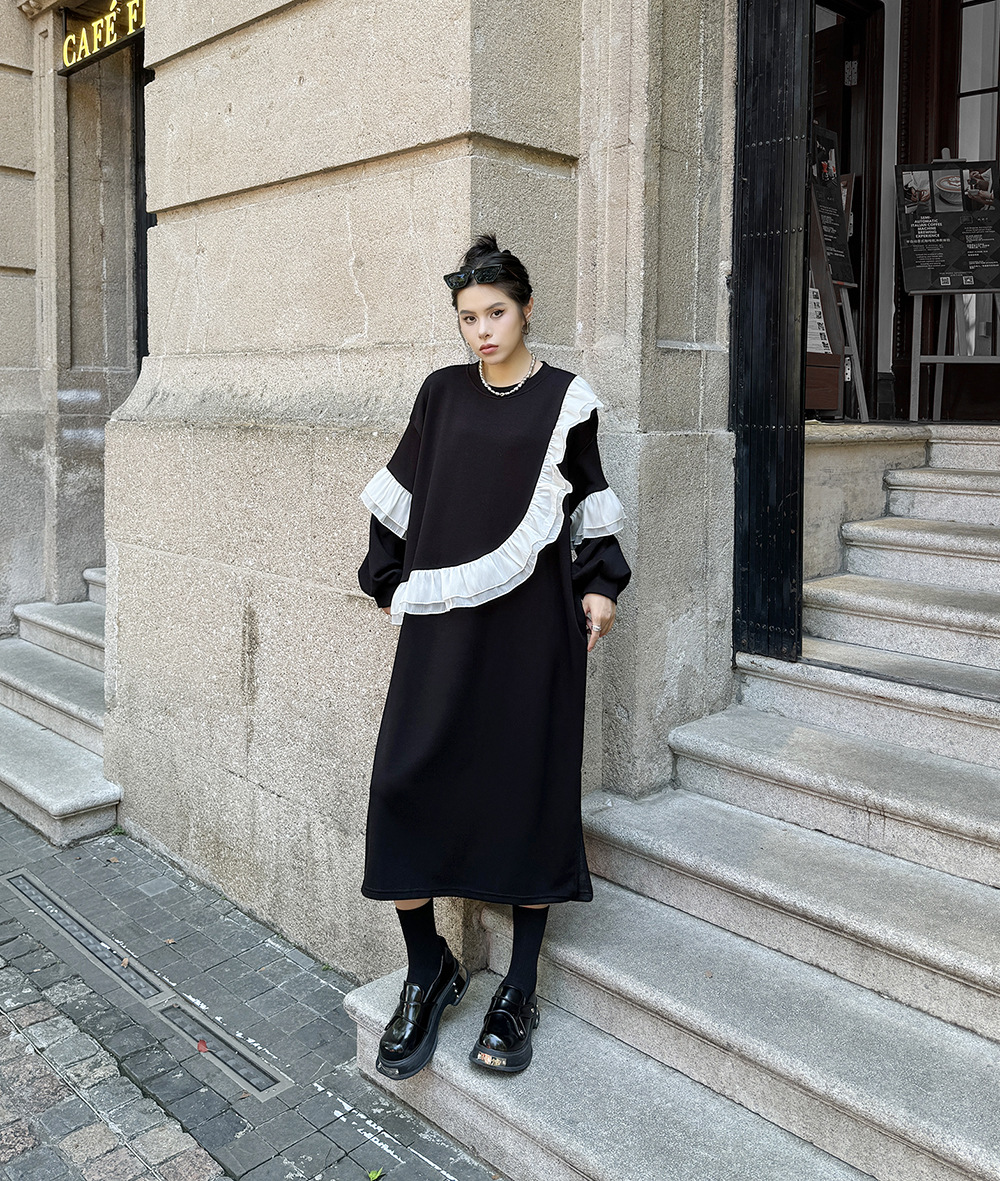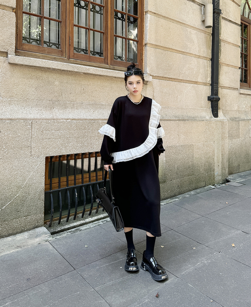 新作 レトロ ワンピース デザイン 長袖ワンピース ラッフル 切り替え ワンピース ラウンドネック ゆったり 大きいサイズ 着やせ おしゃれ ワンピース レディース パーティードレス