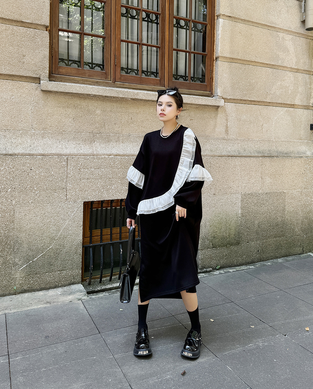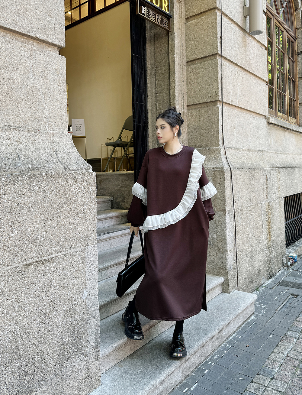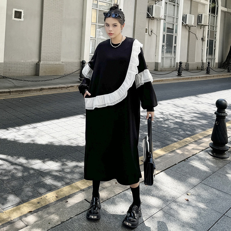 新作 レトロ ワンピース デザイン 長袖ワンピース ラッフル 切り替え ワンピース ラウンドネック ゆったり 大きいサイズ 着やせ おしゃれ ワンピース レディース パーティードレス
