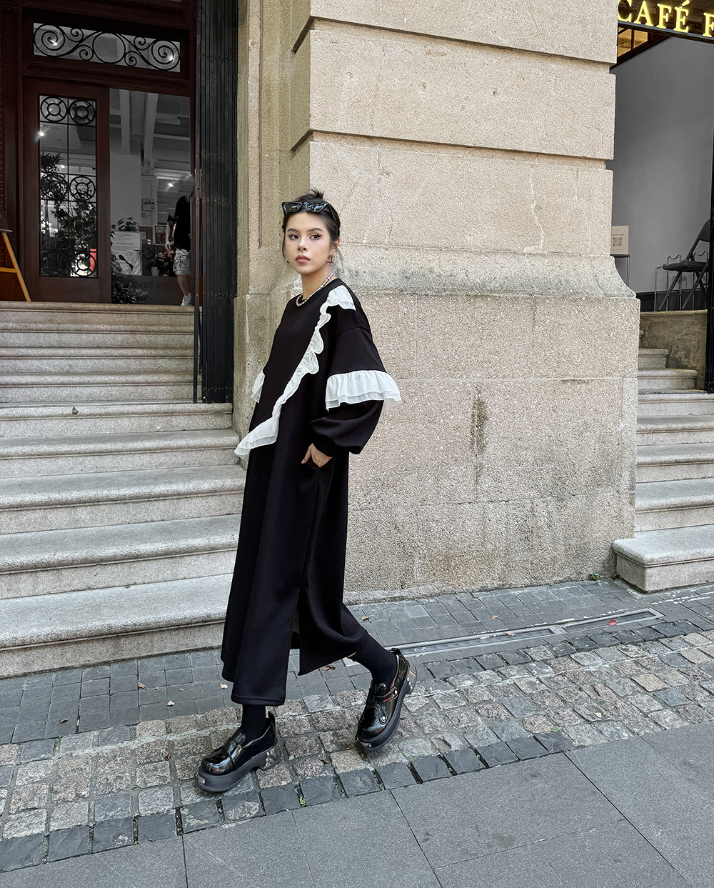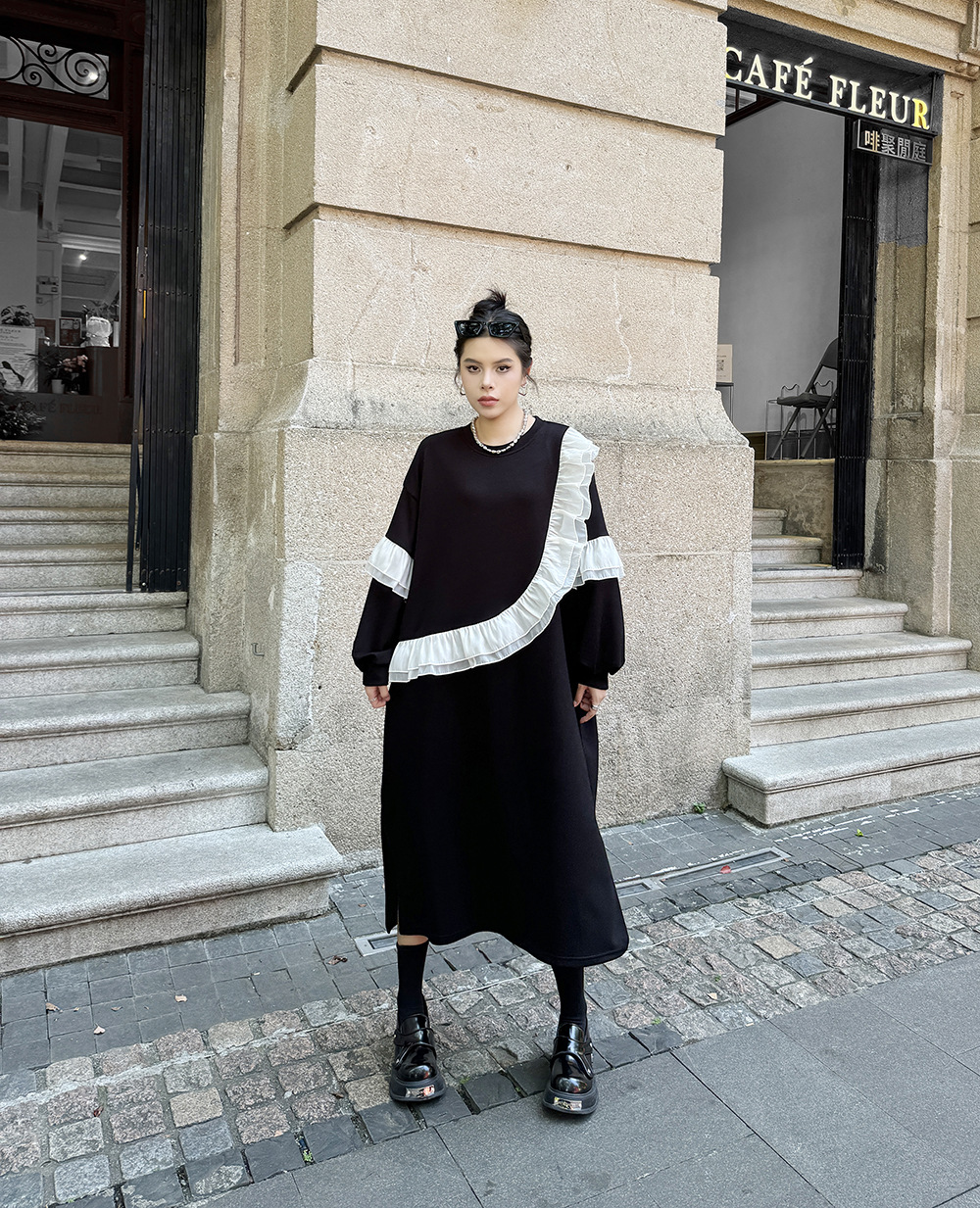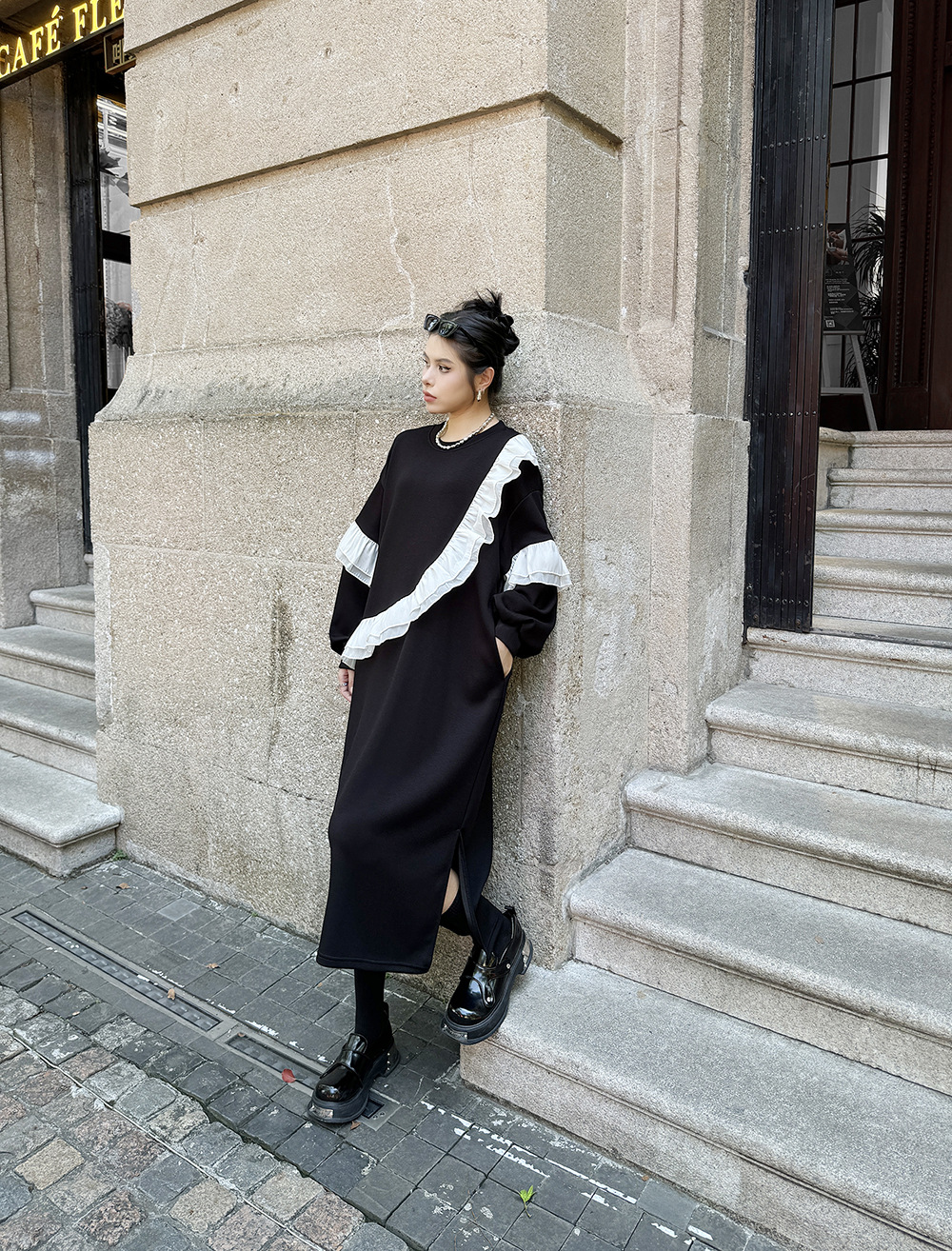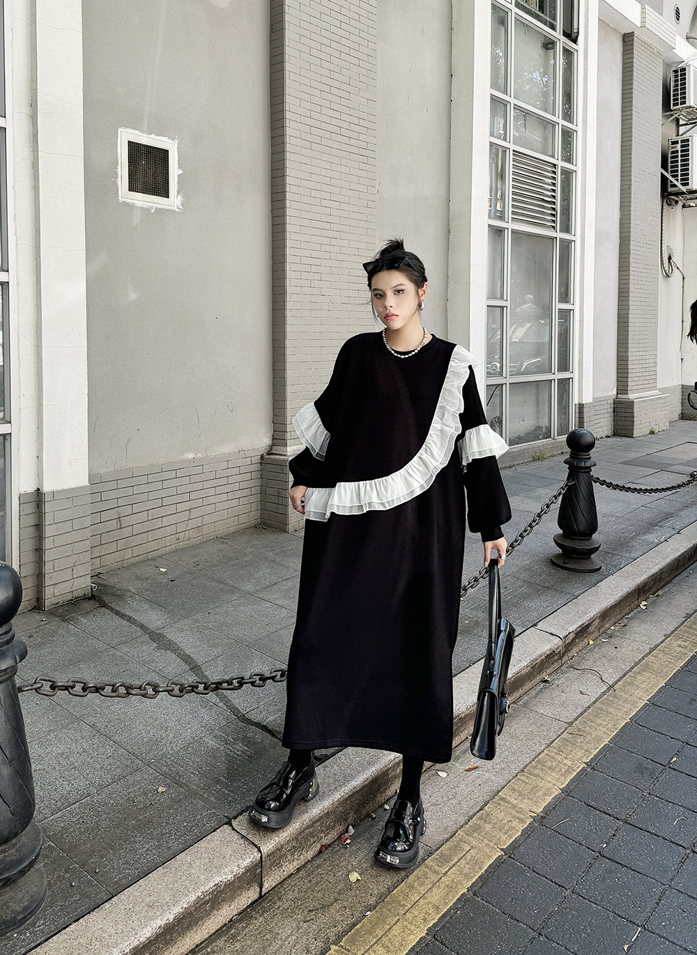 新作 レトロ ワンピース デザイン 長袖ワンピース ラッフル 切り替え ワンピース ラウンドネック ゆったり 大きいサイズ 着やせ おしゃれ ワンピース レディース パーティードレス