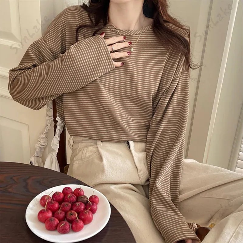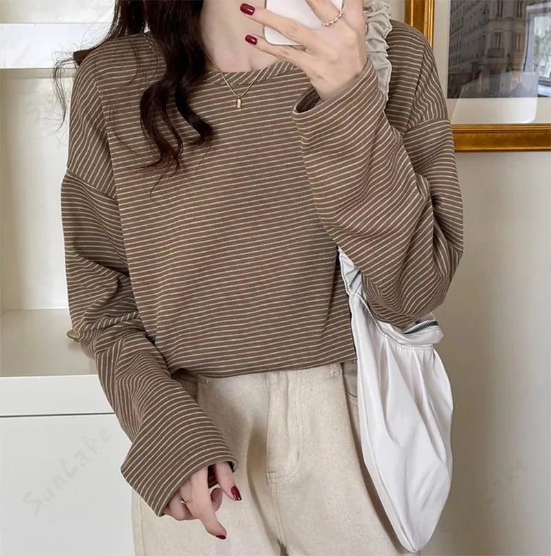 ニットタッチ万能ボーダーカットソー Tシャツトレーナースウェットトップス ストレッチドロップショルダー韓国ファッション Tシャツ カットソー