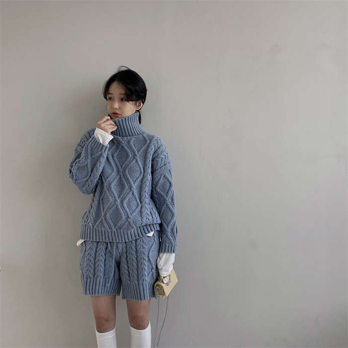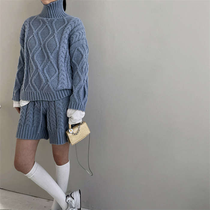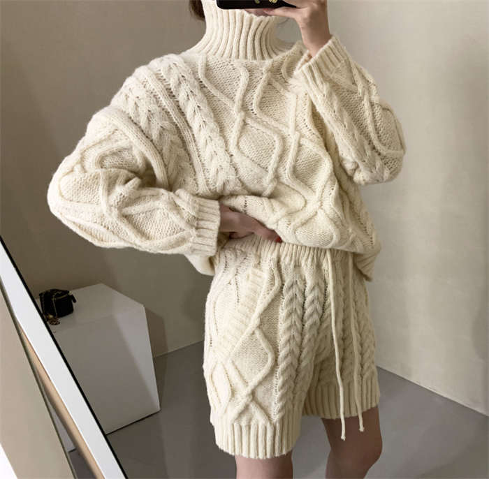 セットアップ レディース 秋冬 ニット ルームウェア ショートパンツ きれいめ 長袖 ケーブル編み 上下セット 2点セット ハイネック パンツスーツ ニットウェア 大人 お洒落 暖か 防寒 出かけ 女