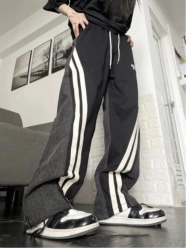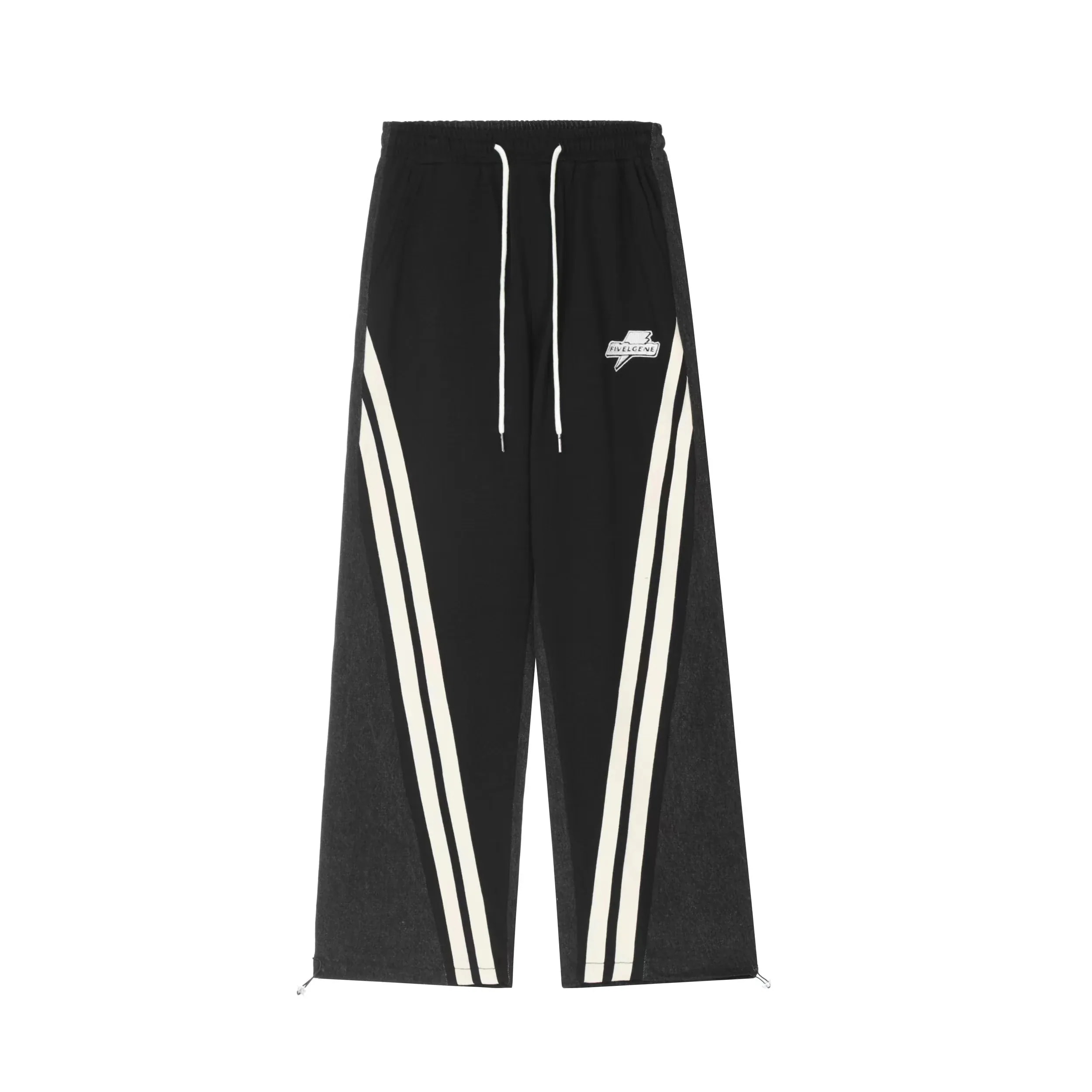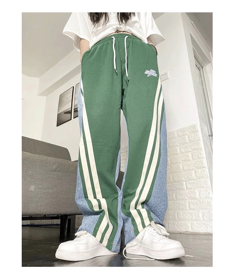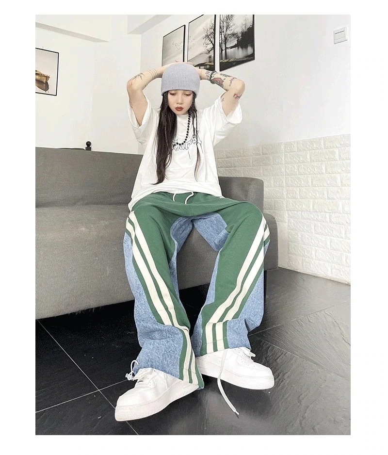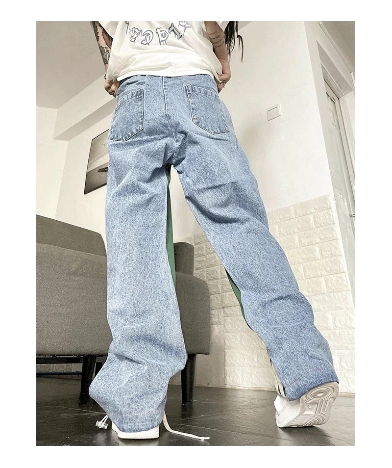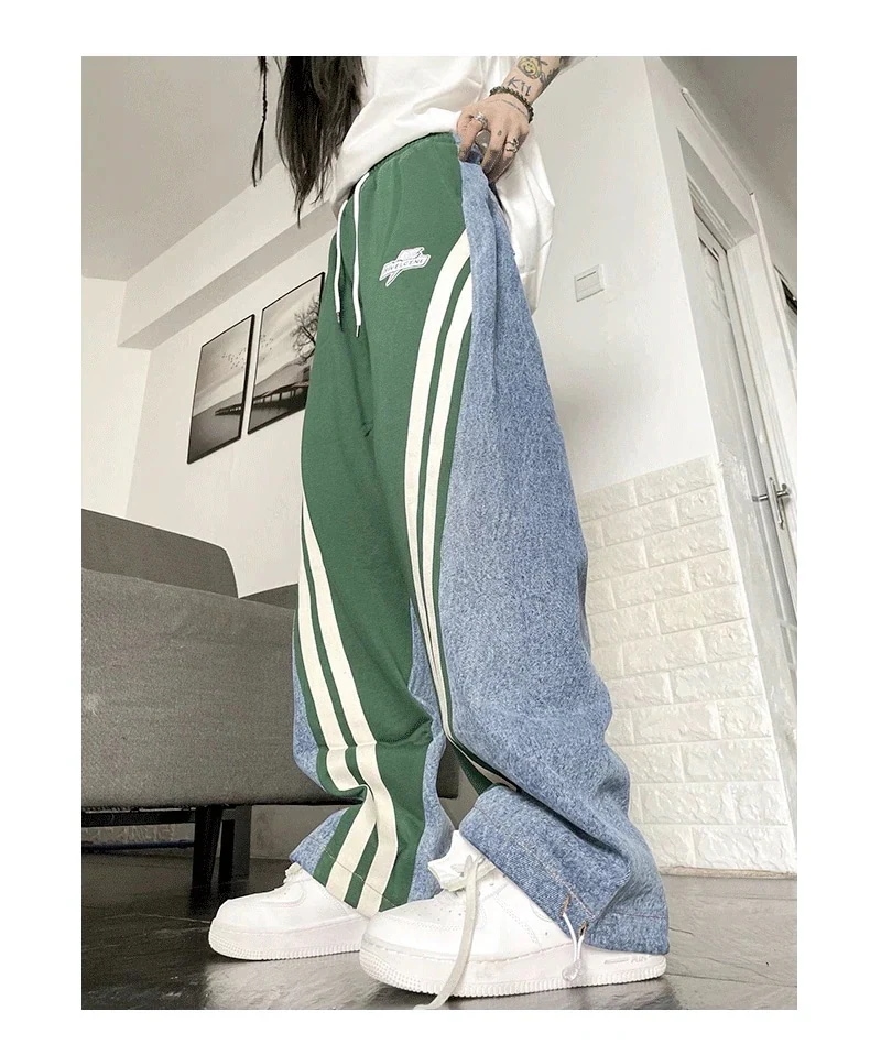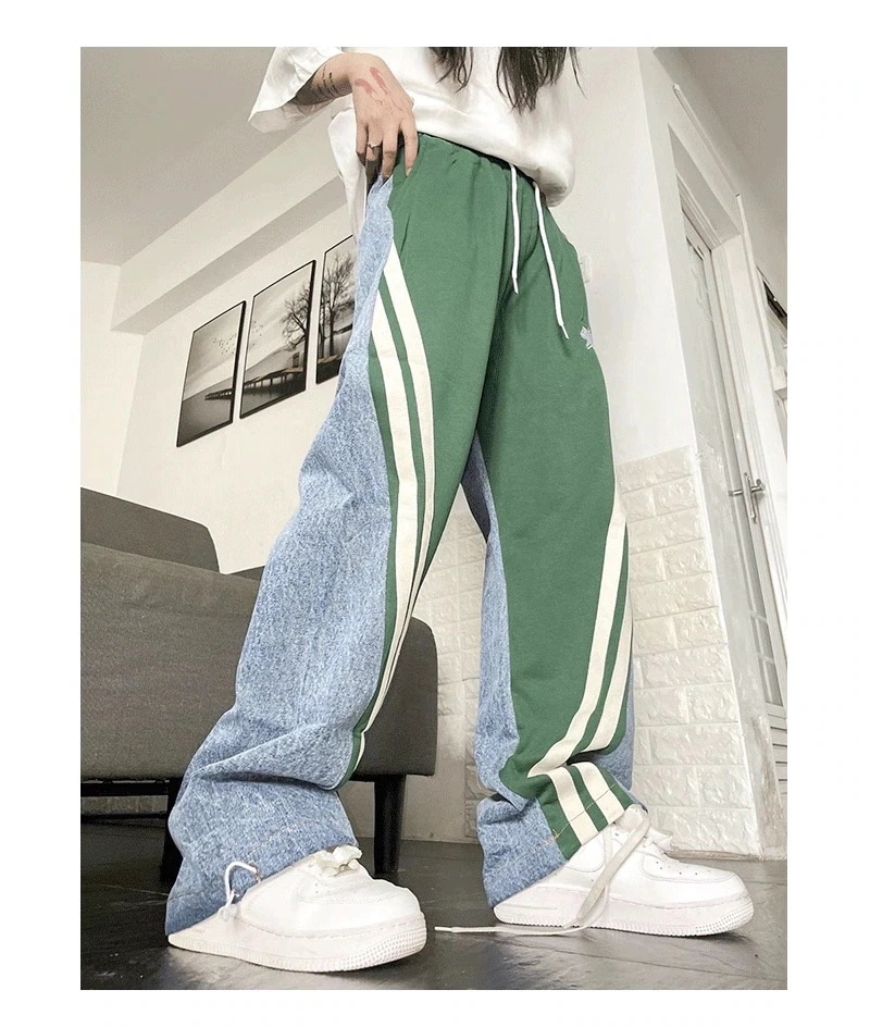 異素材MIXデニム スウェットデニム デニム スウェット ボトムス カジュアル ストリート アメカジ ユニセックス 切り替え バイカラー 配色 体型カバー D116