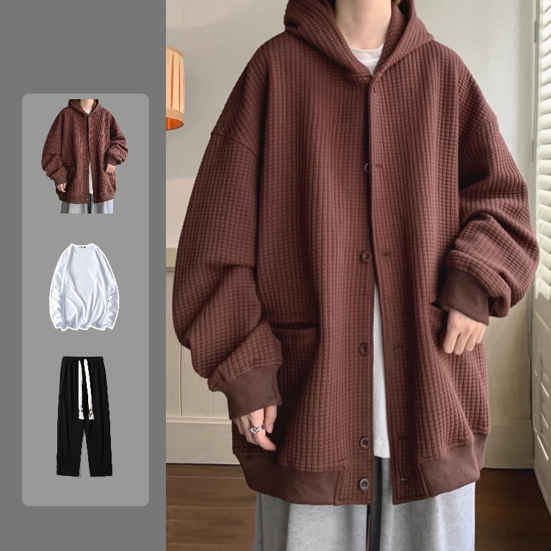 高級感 パーカー セットアップ シンプル ワッフルチェック メンズ 3点セット フード付きアウター+tシャツ+カジュアルパンツ