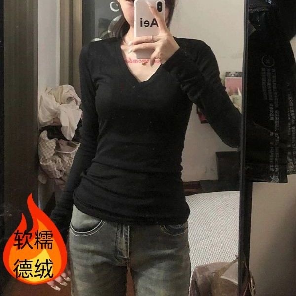 裹起毛 アメリカンレトロドイツンベルベット長袖ボトムシャツ2025秋冬パッド入りスパイスガールズスリム無地インサイドアウトデザイントップス ニット