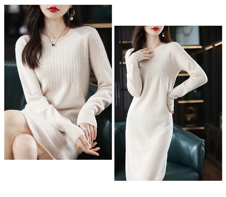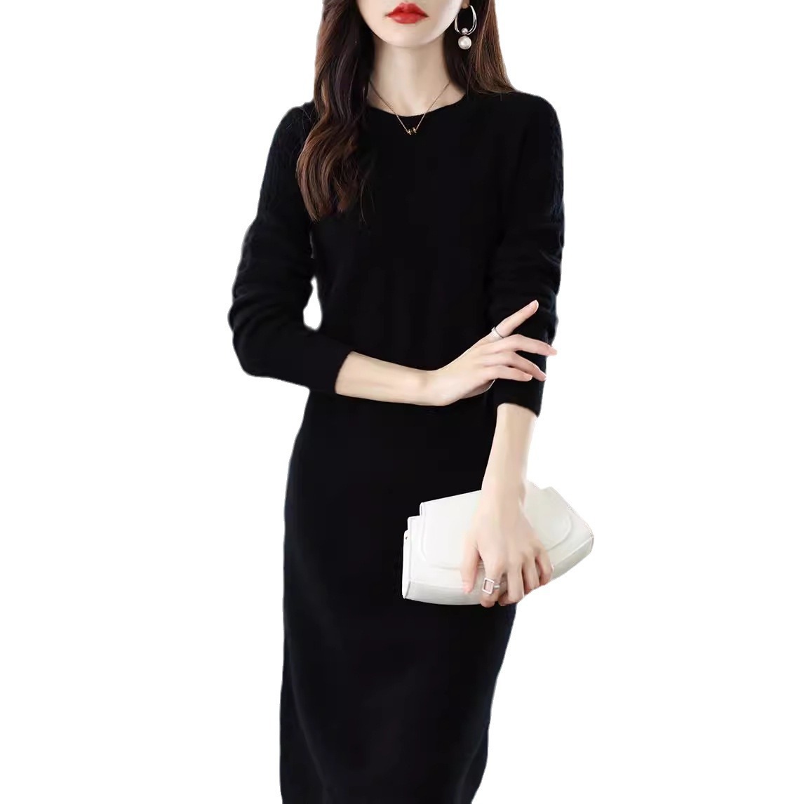 秋冬新作おしゃれ気質スリム丸首純色ニットセーターミディアムワンピース女[4カラー] ニットワンピ