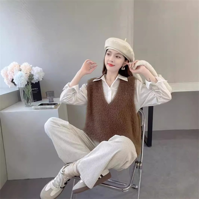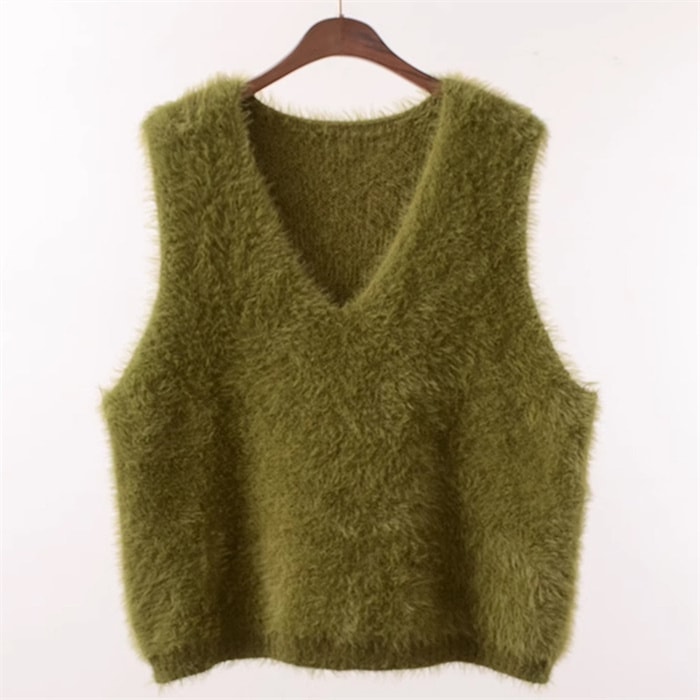 ファーベスト vネックベスト レディース 秋 冬 プルオーバー ベスト トップス ふわふわ ショート丈 ノースリーブ 無地 シンプル レイヤード 重ね着 もこもこ 大きいサイズ カジュアル 大人可愛い