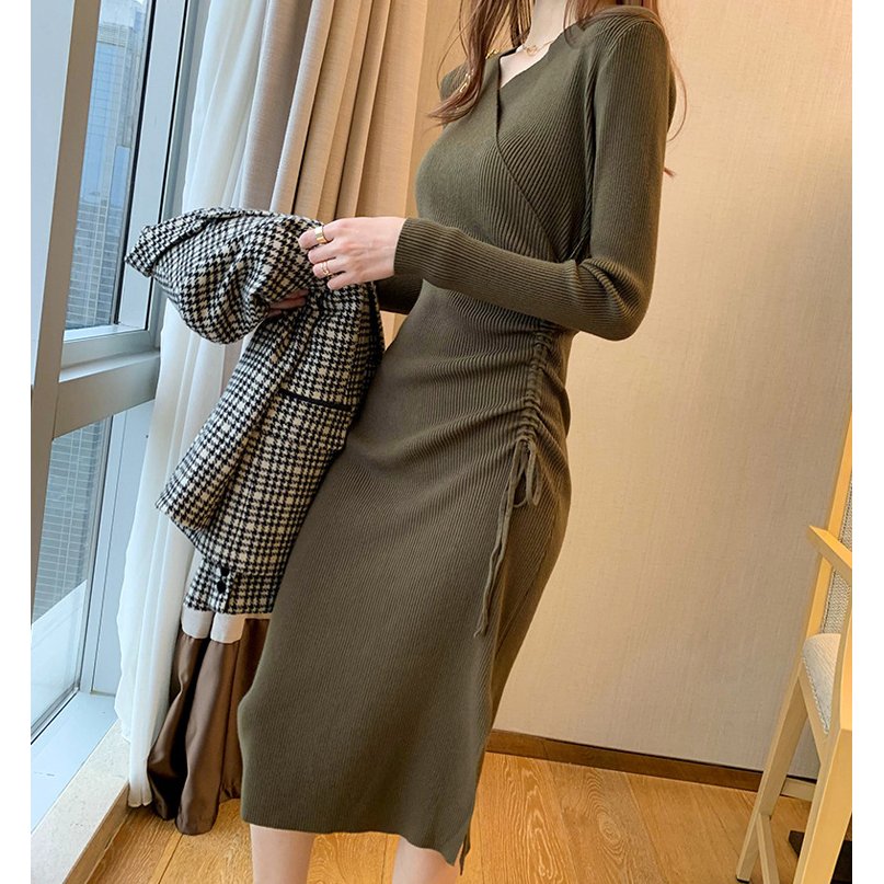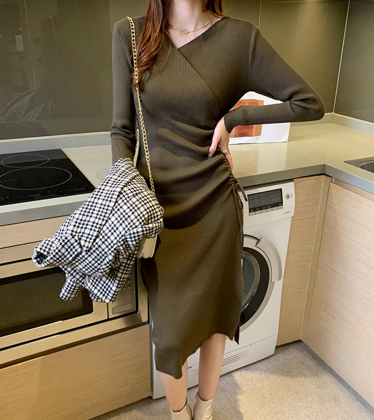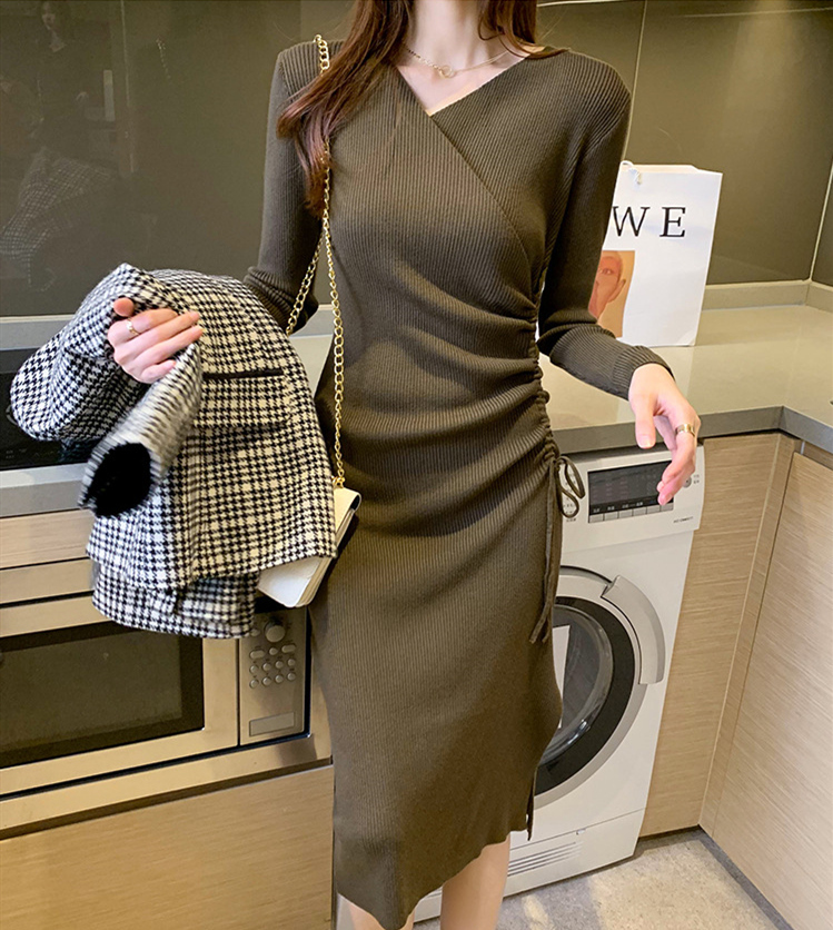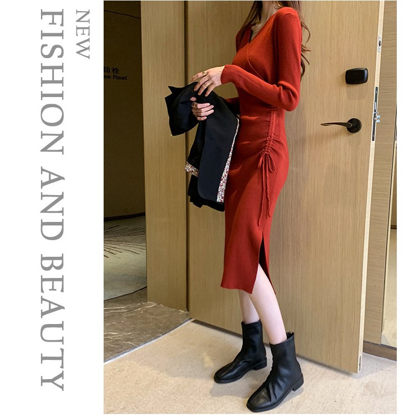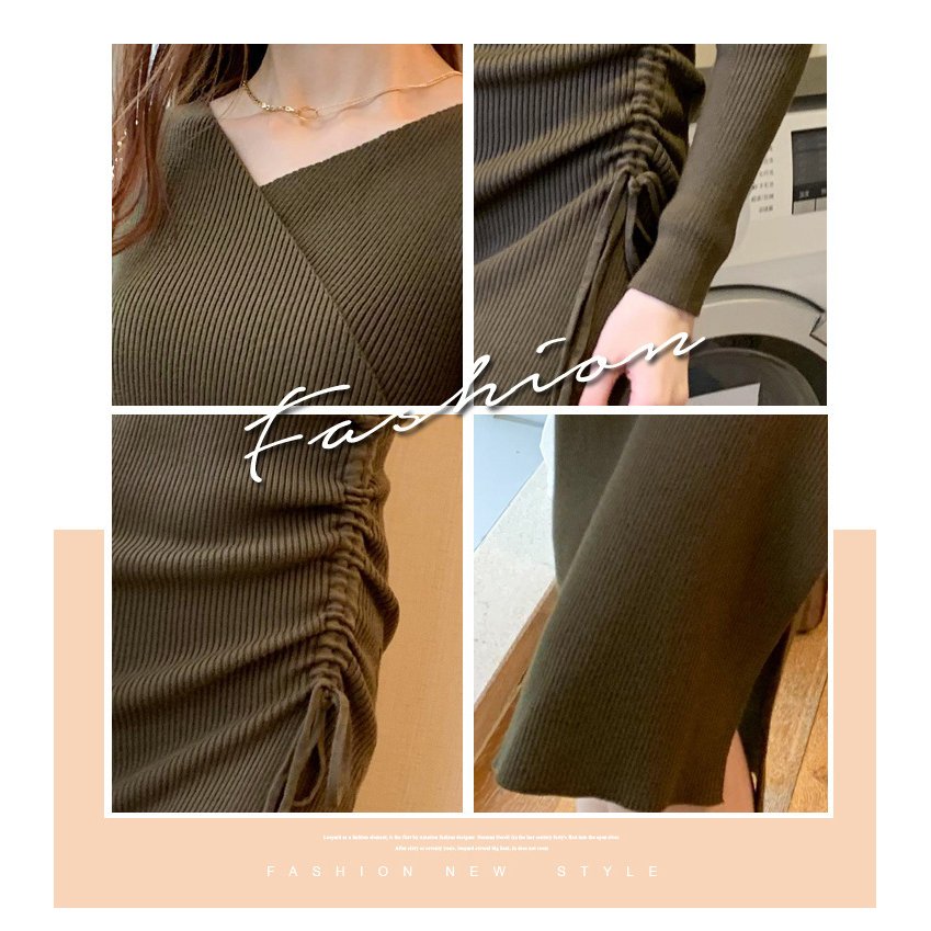 ニットワンピース レディース 長袖ワンピース Vネック 秋冬 新作 おしゃれ タイトニット スカート ロング オシャレ通勤 OL 大人 20代30代40代