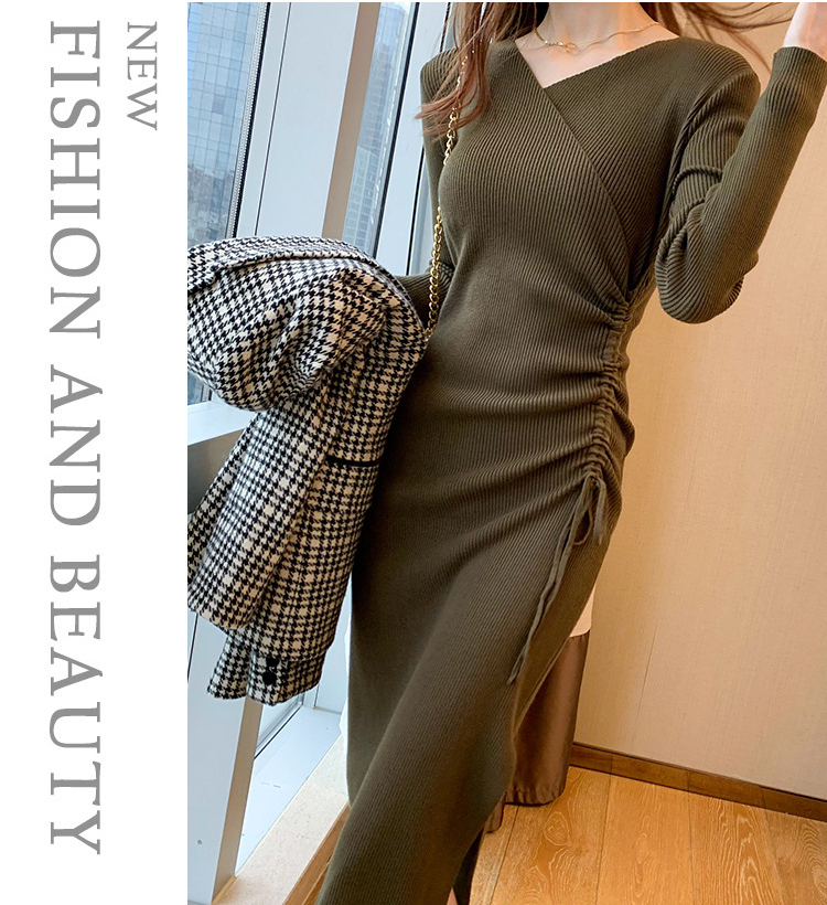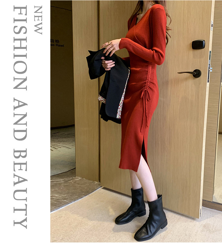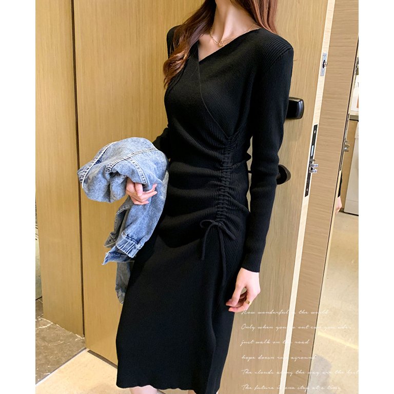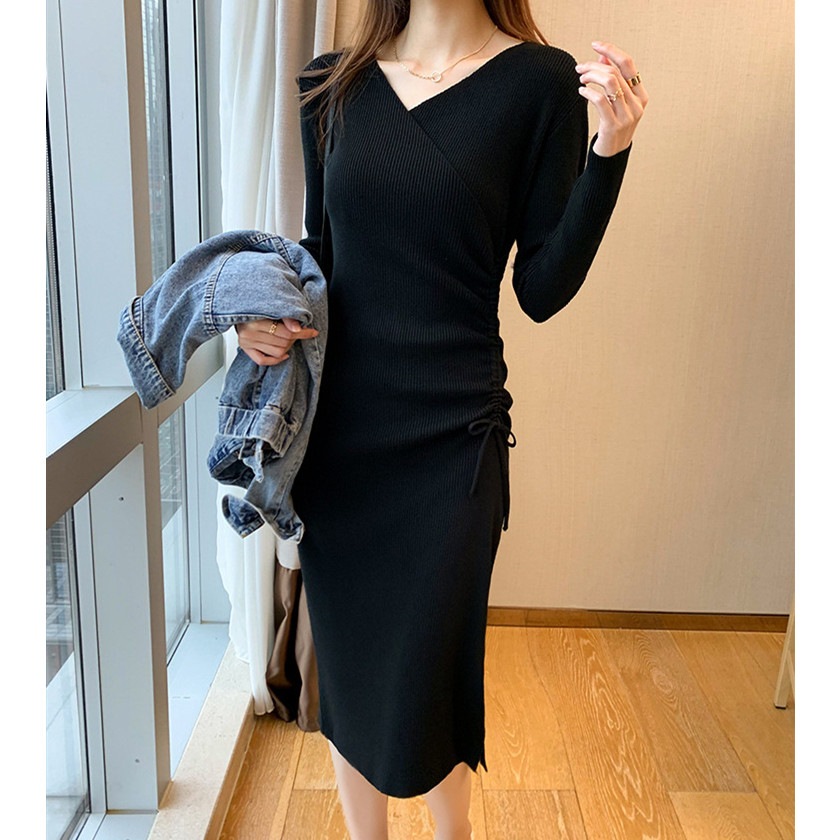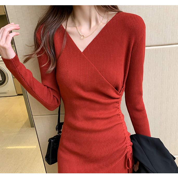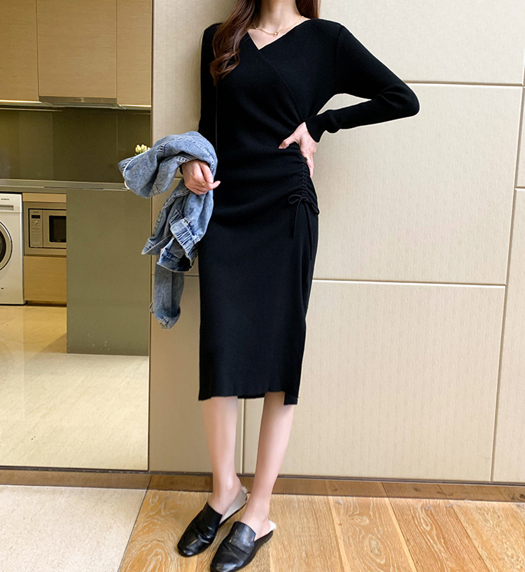ニットワンピース レディース 長袖ワンピース Vネック 秋冬 新作 おしゃれ タイトニット スカート ロング オシャレ通勤 OL 大人 20代30代40代