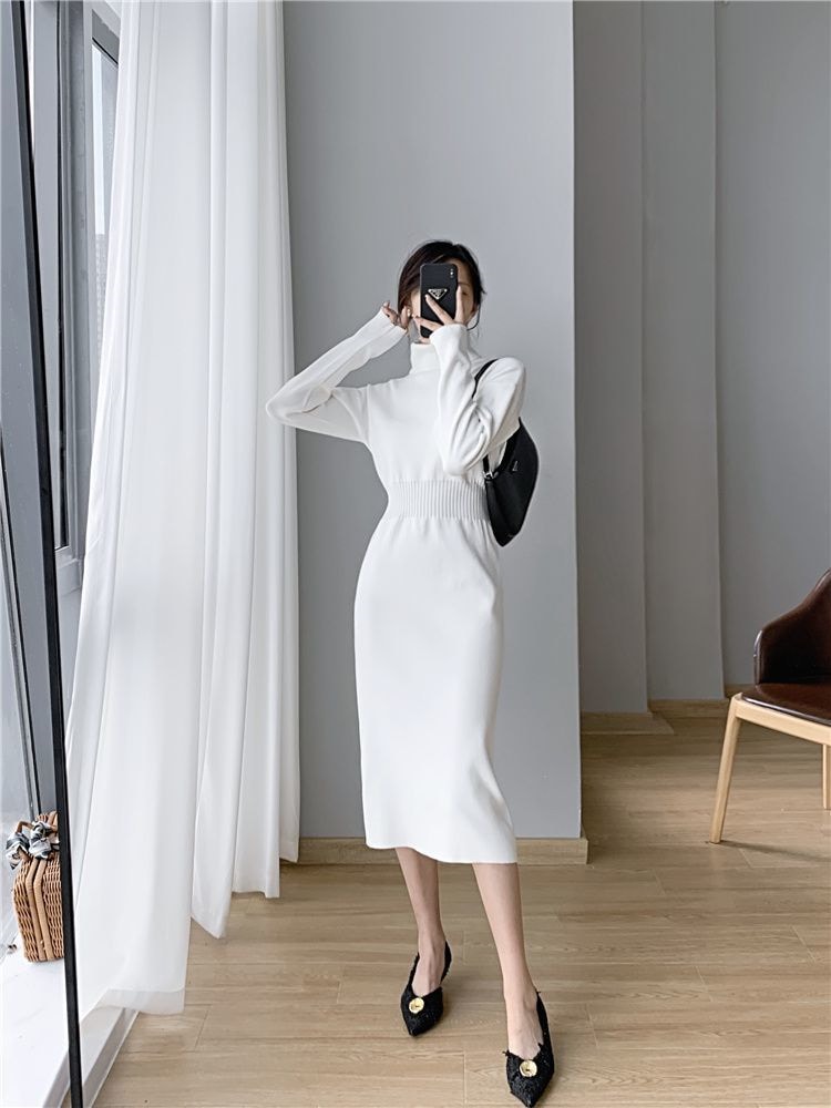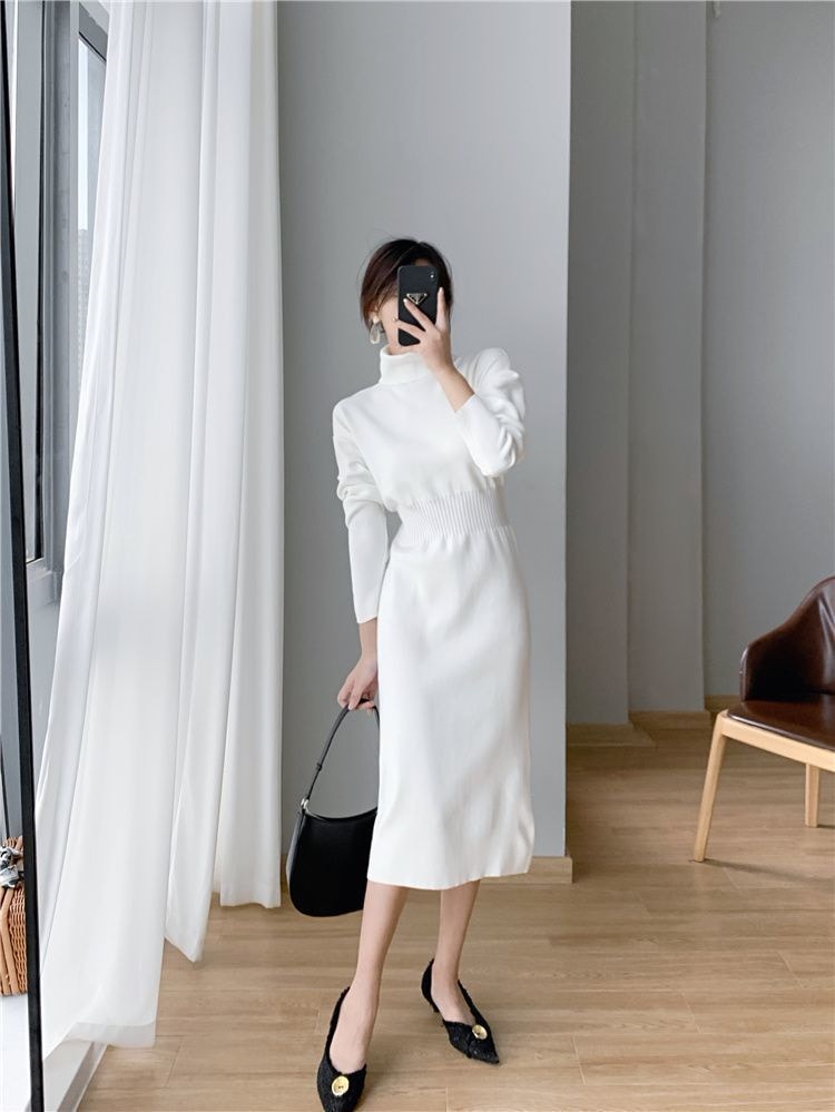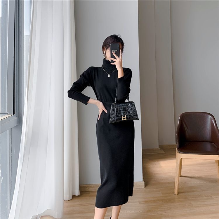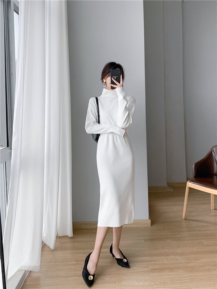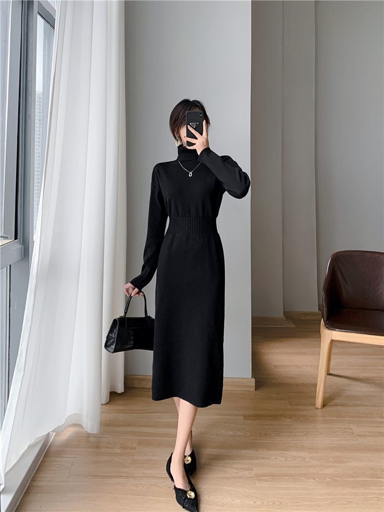 秋冬新作 セーターニット長袖 ワンピース ウエスト引き締め ロング丈 ベーシックニットロングワンピ ニットワンピ