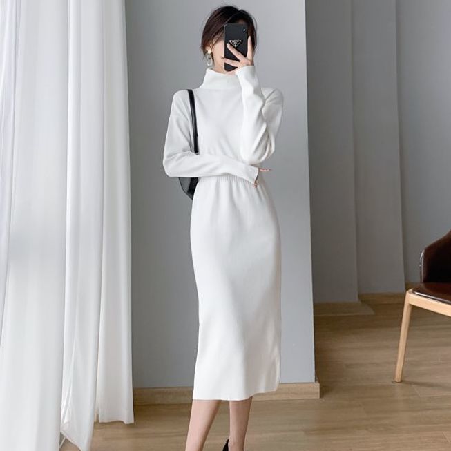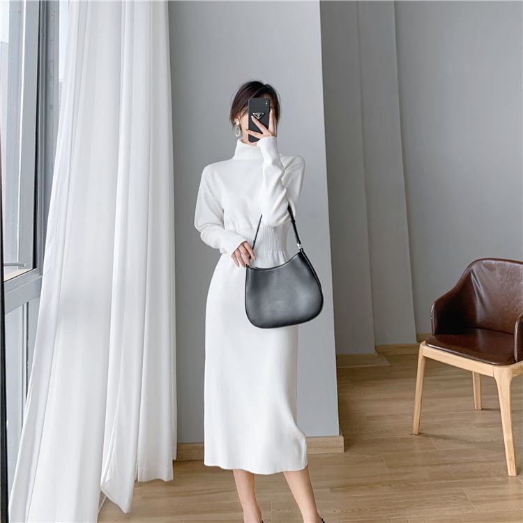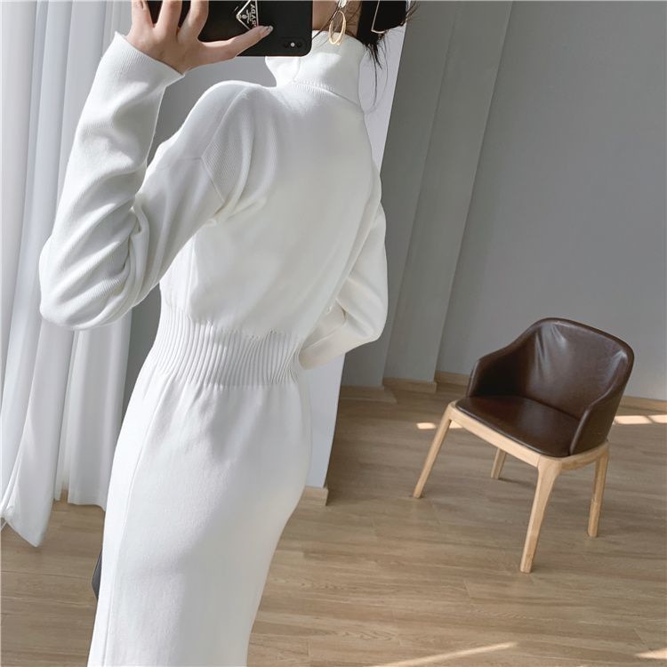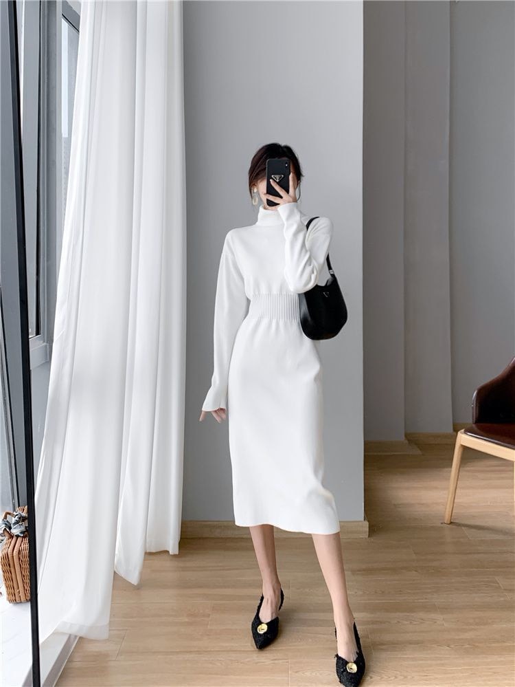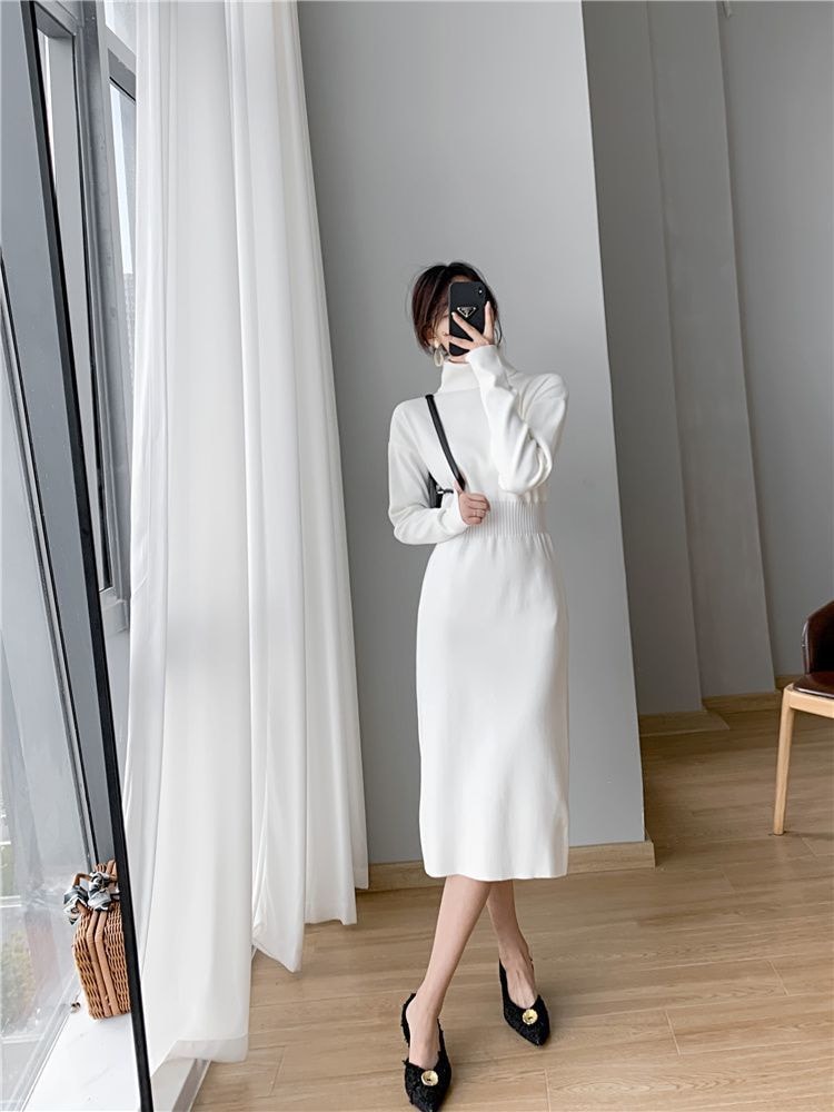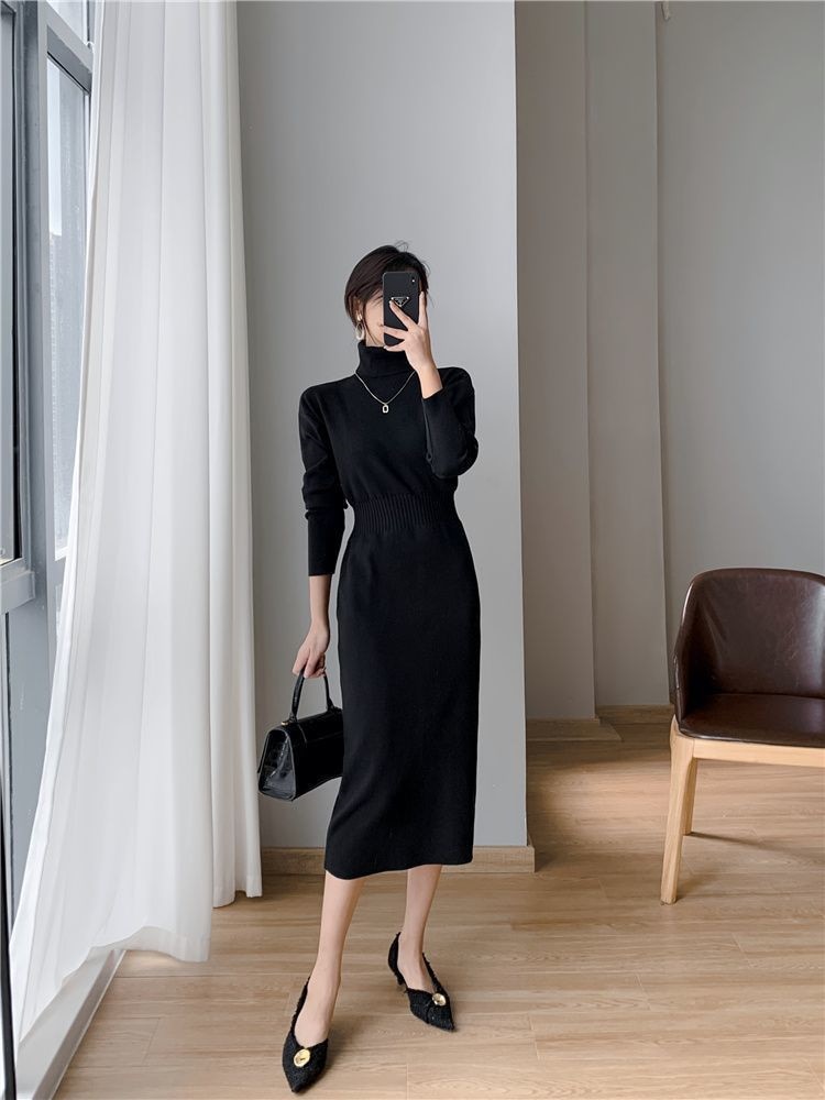 秋冬新作 セーターニット長袖 ワンピース ウエスト引き締め ロング丈 ベーシックニットロングワンピ ニットワンピ