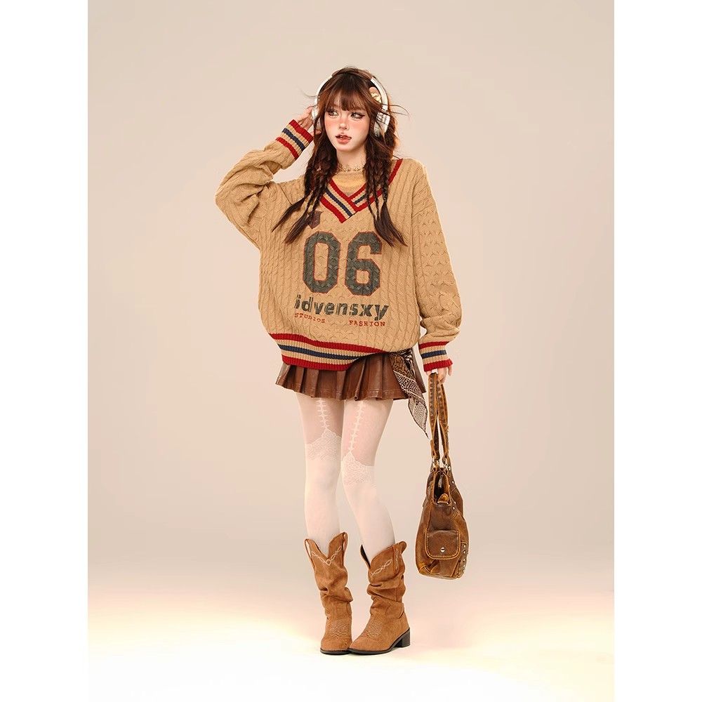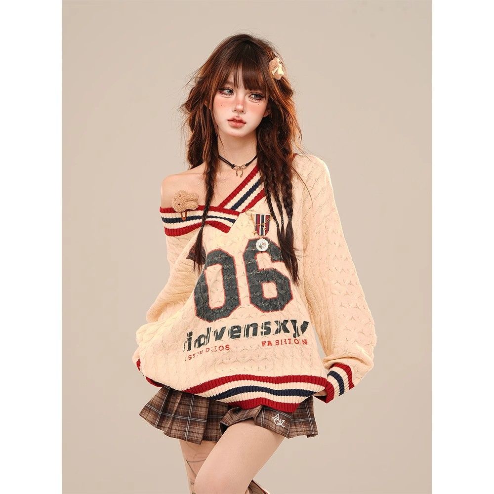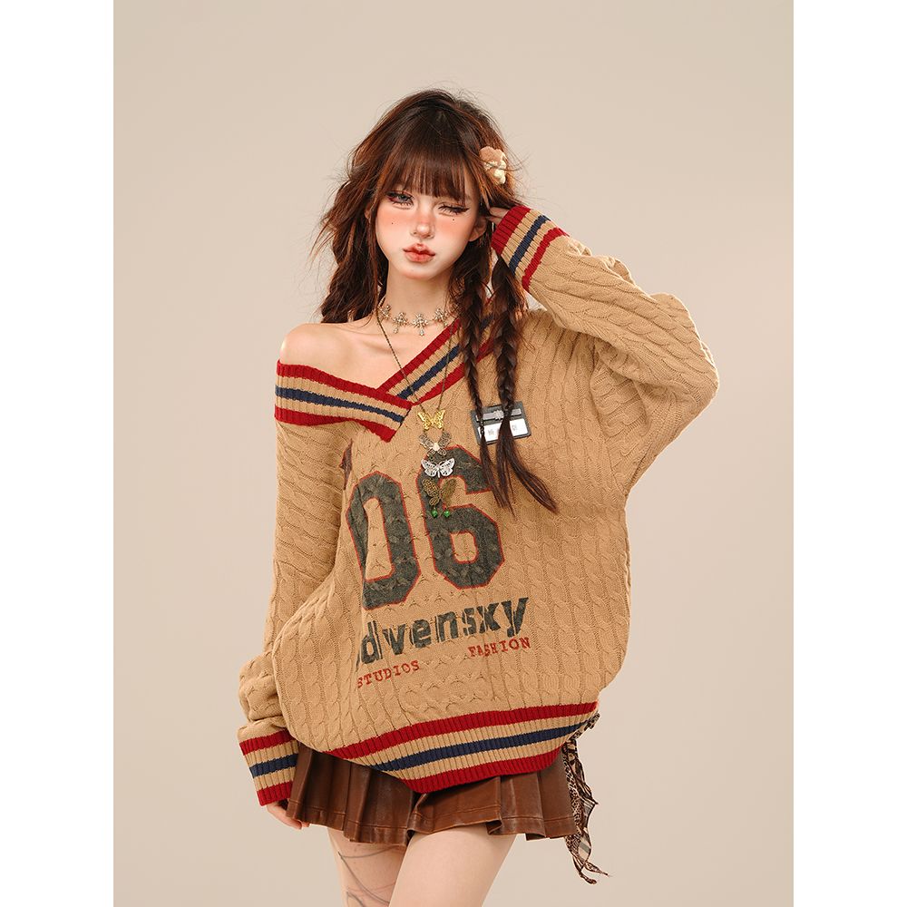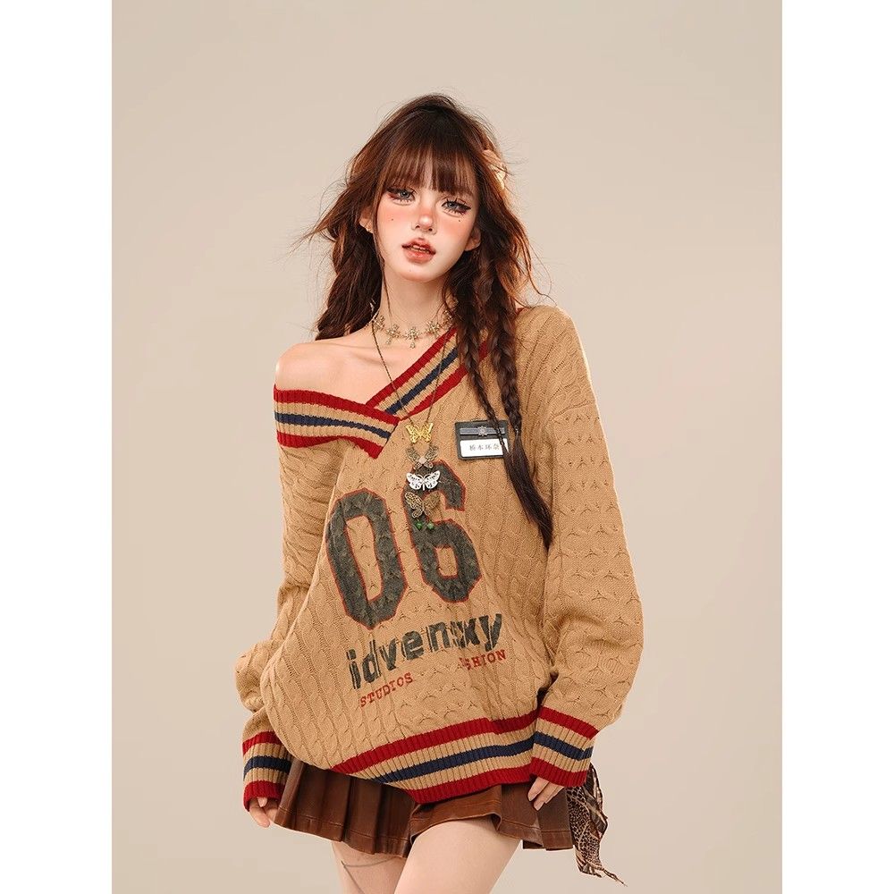 アメリカンカジュアル風のオフショルダーセーター春秋冬向けのゆったりVネックケーブルニットトップス ギャル系ファッション ニット
