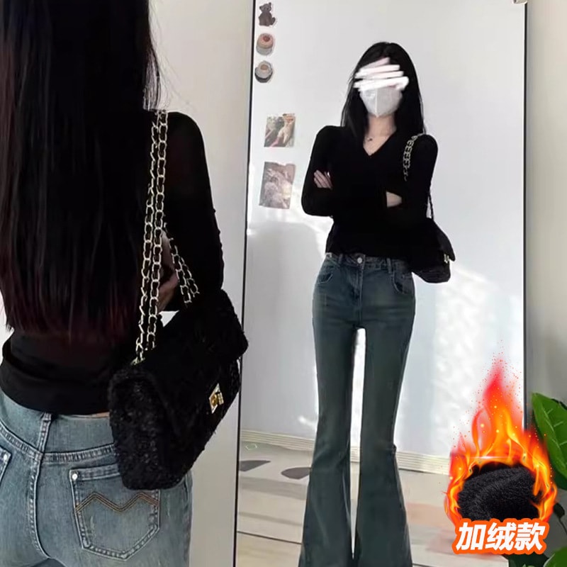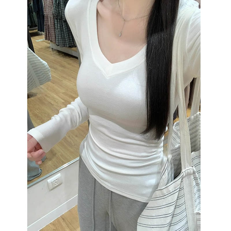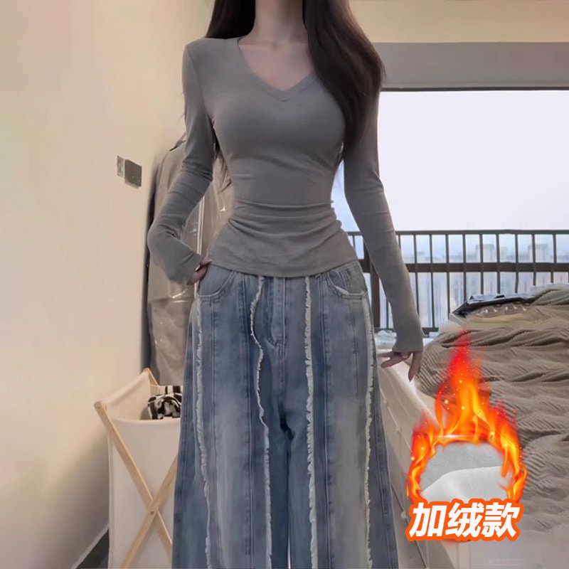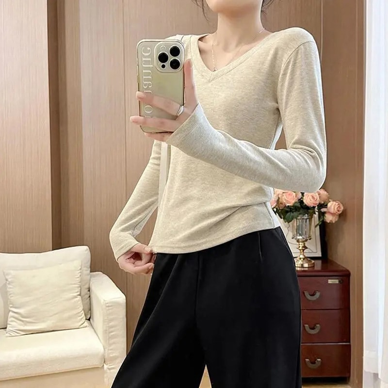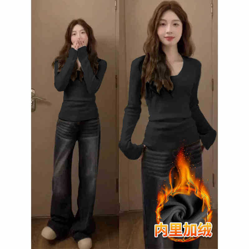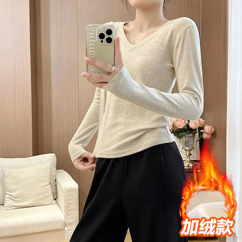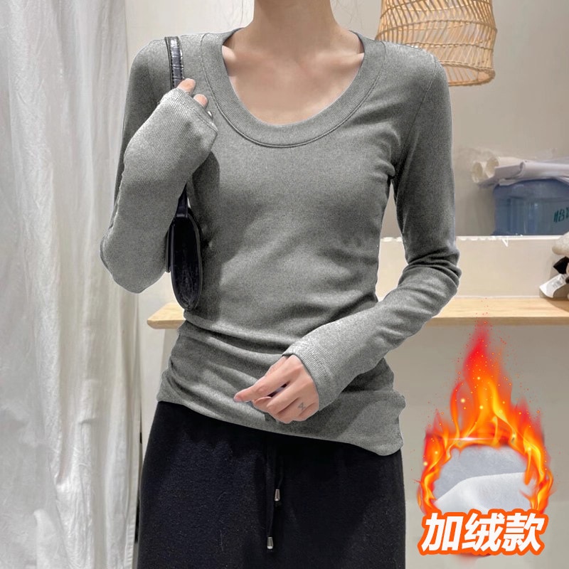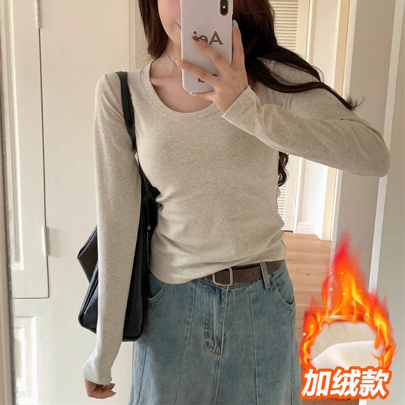 裹起毛 ラウンドネックソリッドカラー暖かいTシャツ秋と冬のパッド入りボトミングシャツピンチウエストポジショルダー長袖ブラウスボトムス服女性の下着
