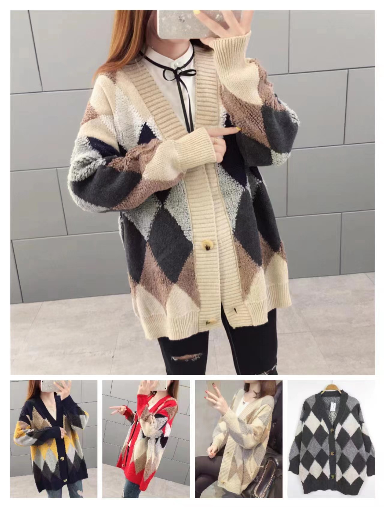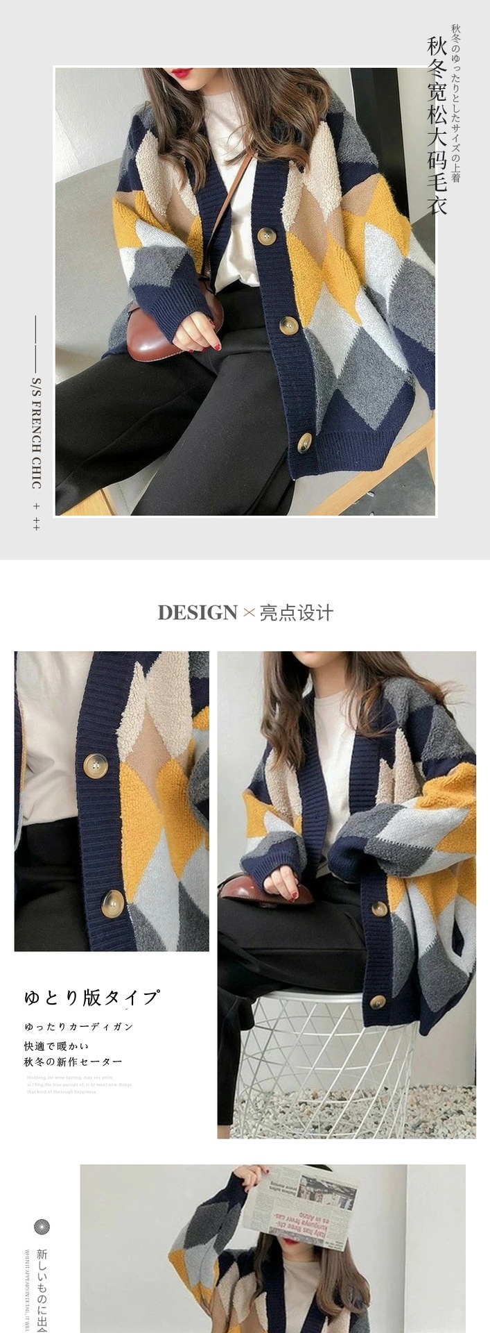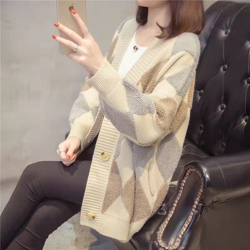 秋 冬ファッション2024秋冬ビッグサイズゆったりカジュアルニットカーディガンレディースミディアム丈ひし形ゆったりミリタリーコート[5カラー]