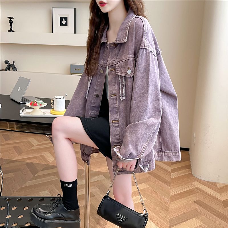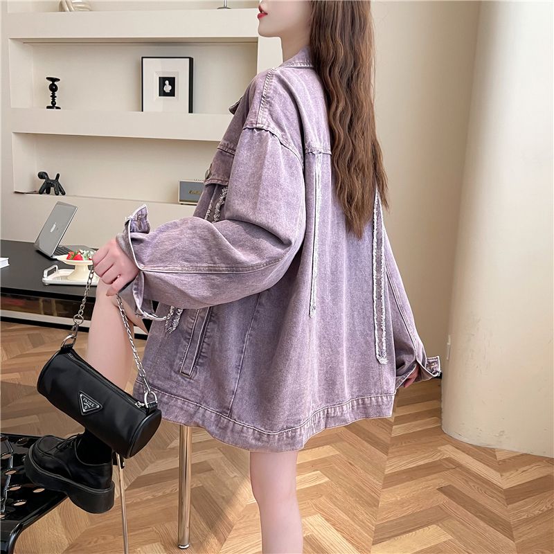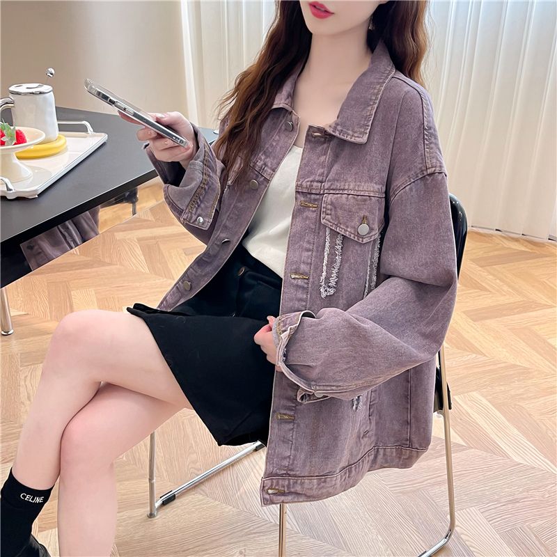 春秋 人気 パープルデニムジャケット 韓国ファッション 着痩せ 百掛け デニムコート カジュアル怠惰な風春アウター 大きいサイズ 体型カバー長袖トップス