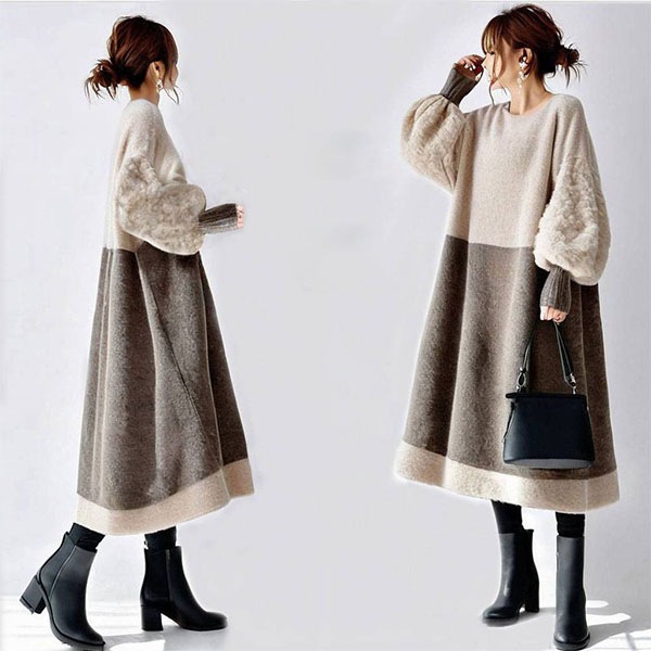レディース ワンピース パフスリーブ 丸襟 長袖セーターワンピース 新作 秋冬 韓国風 通勤 オシャレ 長袖ロング マキシ丈ワンピ