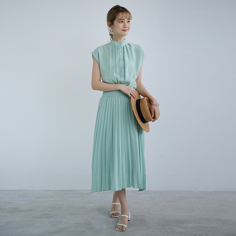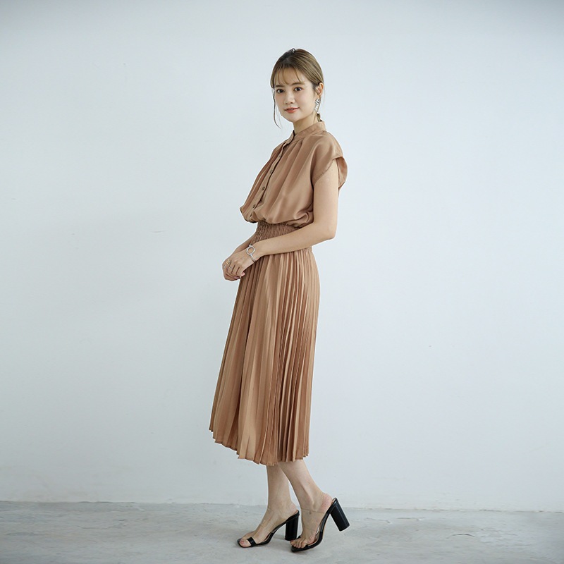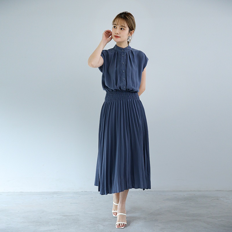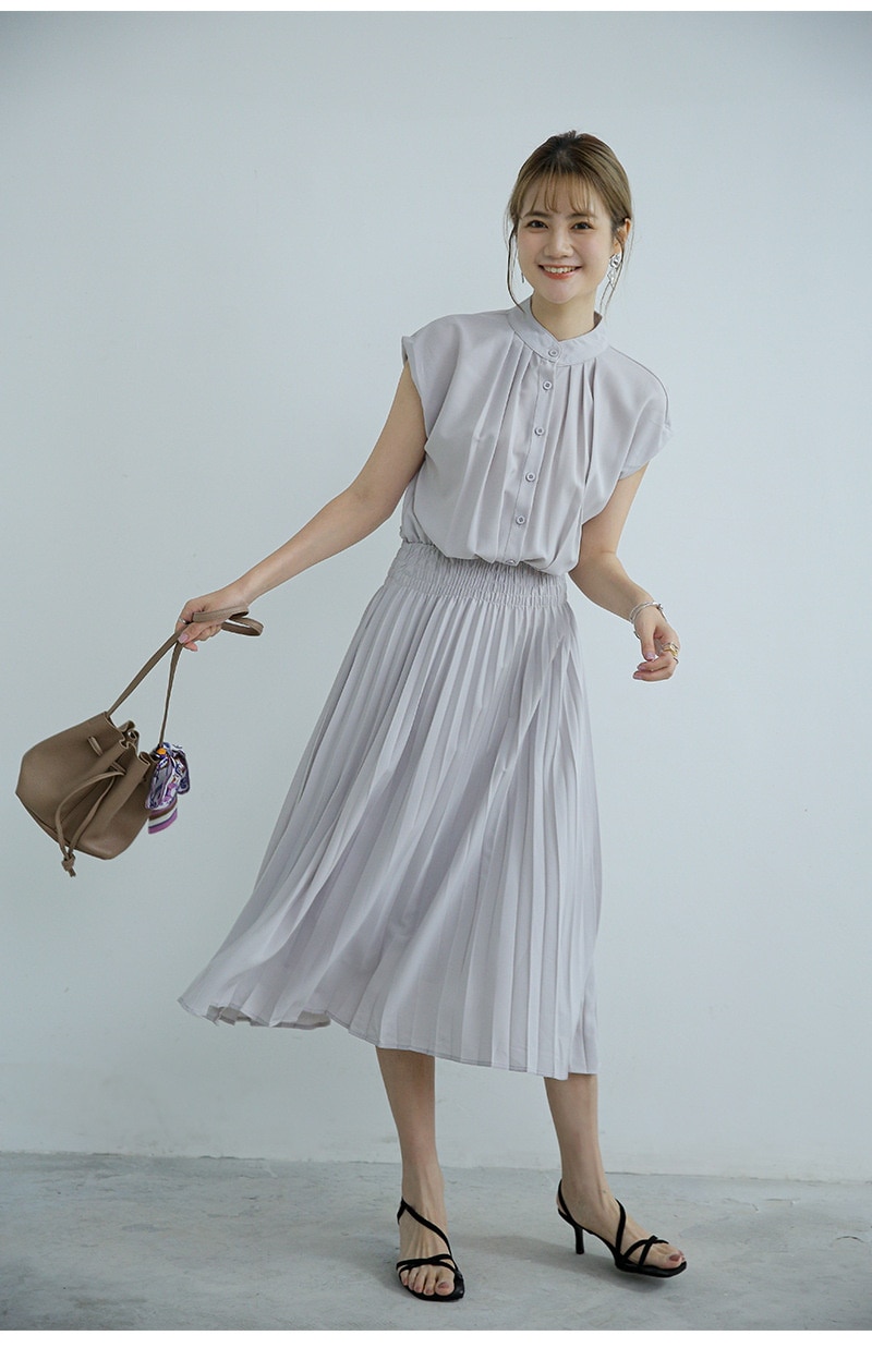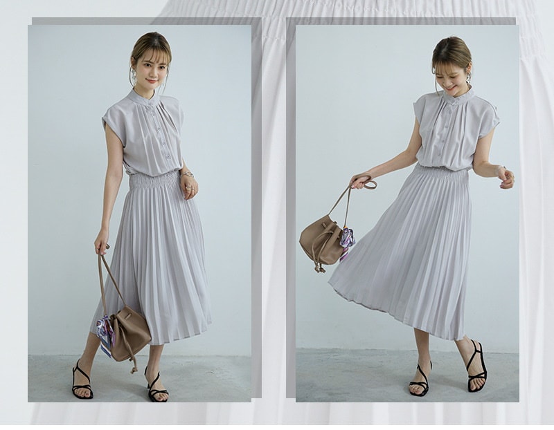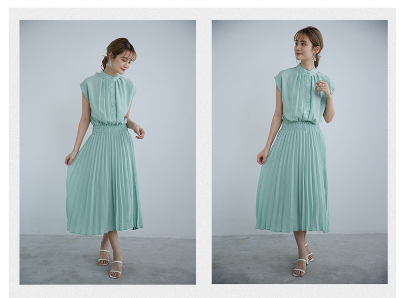 5色 リアルショット春と夏の新しいシフォン長袖プリーツドレススリミング薄い気質プリーツスカート 半袖ロング マキシ丈ワンピ